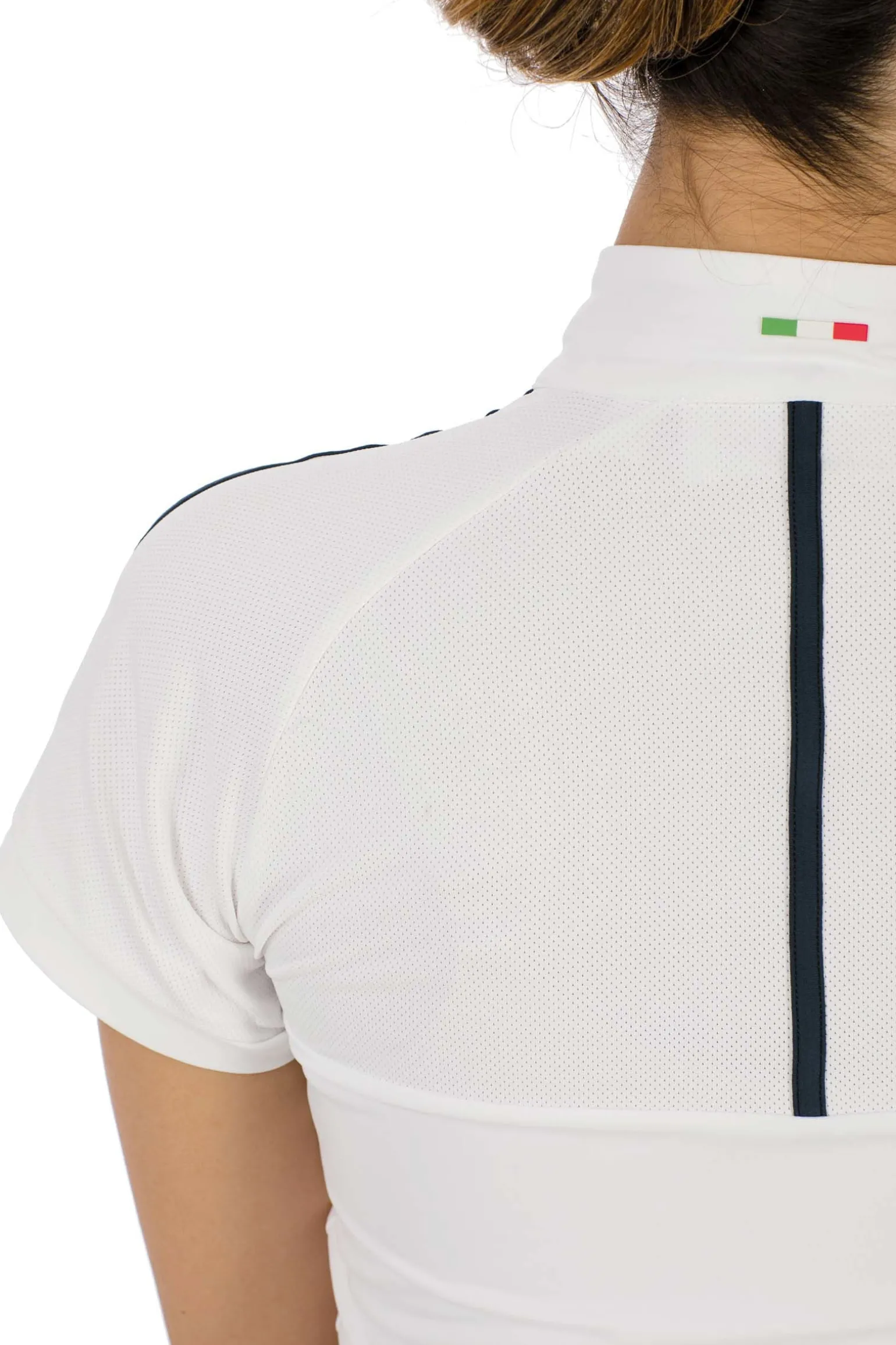 Das Evora Competition Shirt hat eine leistungsorientierte Passform mit klaren sportlichen Details. Dieses kurzärmelige, weiße Turniershirt besteht aus feuchtigkeitsableitendem Material und atmungsaktiven Mesh-Einsätzen an Latz, Rücken und sportlich geschnittenen Ärmeln.