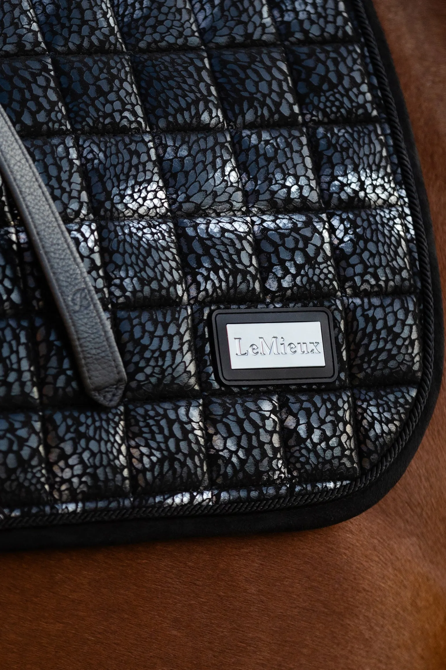 Diese superweiche Wildlederschabracke ist mit einem metallischen Aufdruck und einem Abzeichen versehen und kombiniert außergewöhnliche Qualität mit auffälligem Stil. Die einzigartige Form ist so konzipiert, dass sie auf eine Vielzahl von Dressursätteln passt, Stöße absorbiert und für zusätzliche Polsterung unter dem Sattel sorgt. Unser bahnbrechendes Bambusfutter reguliert die Körpertemperatur, indem es Schweiß und Feuchtigkeit direkt von der Haut Ihres Pferdes ableitet. Es minimiert außerdem die Reibung und sorgt so dafür, dass sich auch Pferde mit der empfindlichsten Haut wohlfühlen. Darüber hinaus sorgt die superweiche Wildlederbindung dafür, dass das Pad seine Form behält. Vervollständigen Sie Ihr Reit-Setup mit dem passenden Baselayer und der Hutseide.