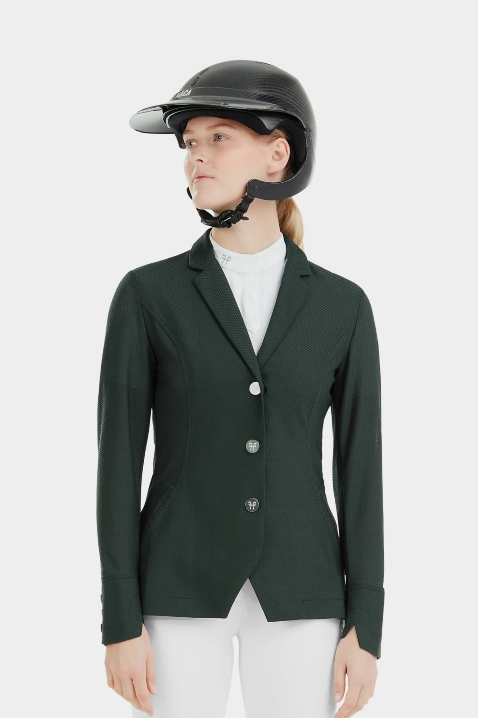 Leichte, atmungsaktive Sportjacke für Wettbewerbe. Wie das beliebte Aerotech Jacket bietet auch das neue Aeromesh eine komplette Turnierausstattung. Der Grundschnitt ist der gleiche: eine ergonomische Passform, die mit jeder Bewegung beim Reiten mitgeht. Was das Aeromesh so speziell macht, ist das neue, sehr elastische und dampfdurchlässige Material, das es zum perfekten Turniersakko für den Sommer macht. Überschüssige Wärme kann ungehindert durch die feinen Wabenstrukturen im Stoff entweichen, so bietet es besten Tragekomfort. Das Aeromesh Jacket ist so leicht, dass man es kaum spürt. Neben der rundum technischen Materialien und Ausstattung entspricht das Aeromesh Jacket natürlich den Vorgaben für Turnierbekleidung. Und genau wie das Aerotech ist auch das. Aeromesh Jacket kompatibel mit Horse Pilots Airbag. Ein leichtes Wekkampfsakko für eine stylische Performance.