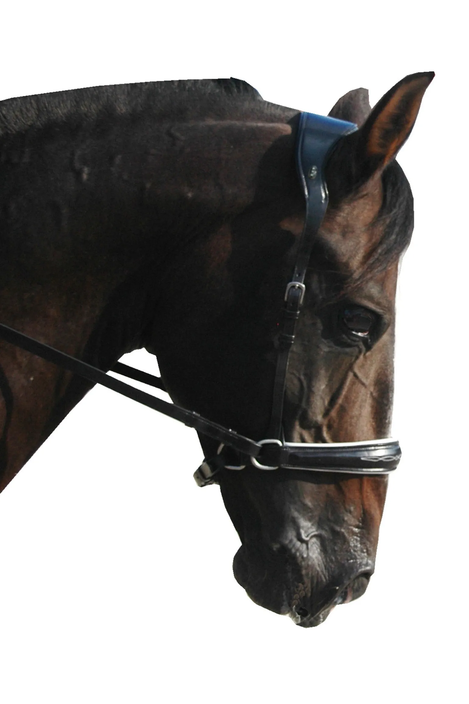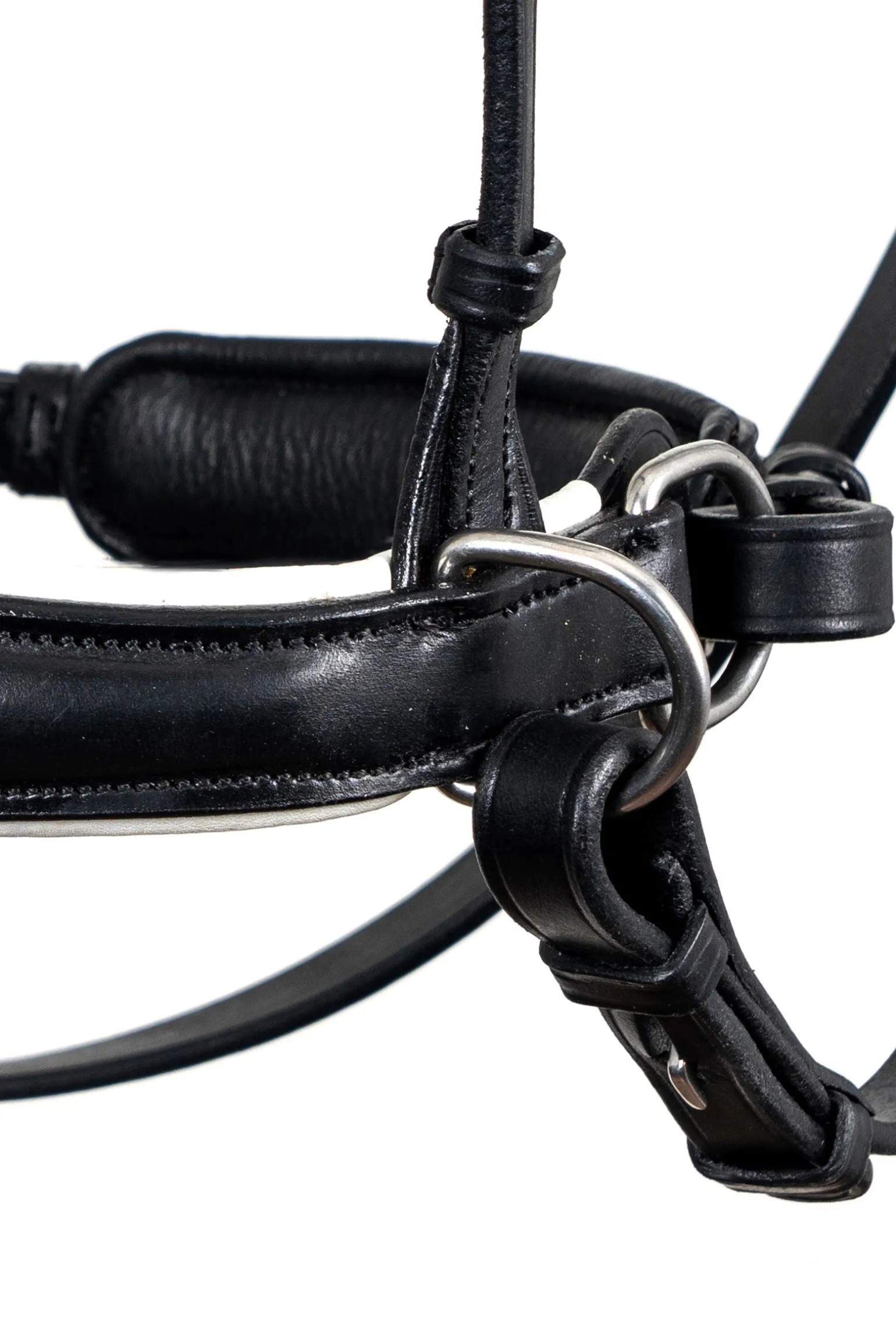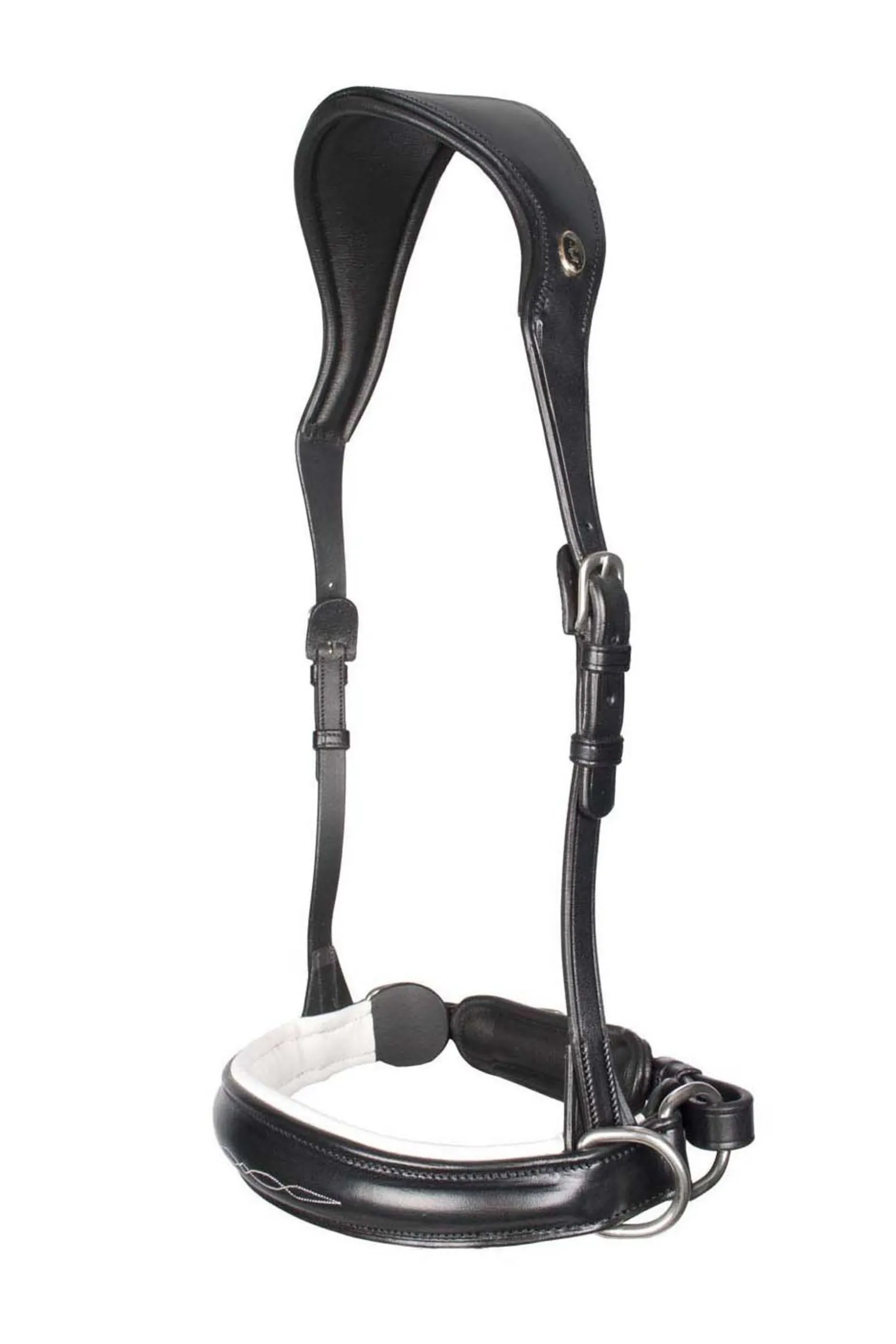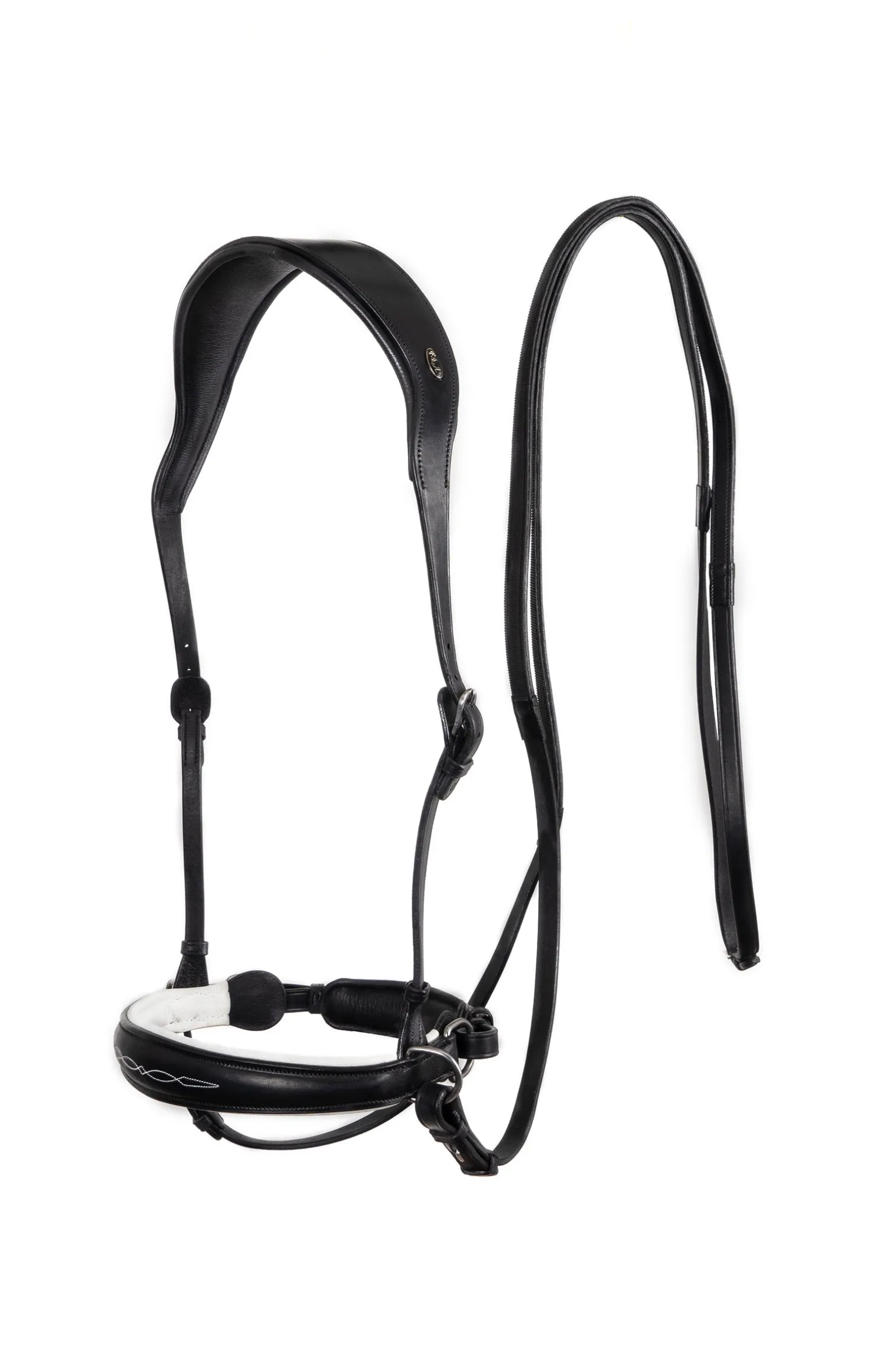 Diese gebisslose Trense gehört zum Top-Segment der F.R.A.®-Kollektion. Sie besteht aus hochwertigem englischem Leder, hat eine satinierte Oberfläche und eine sehr weiche Polsterung. Charakteristisch sind die Nasenpolster in den kontrastierenden Farben Weiß und Beige.