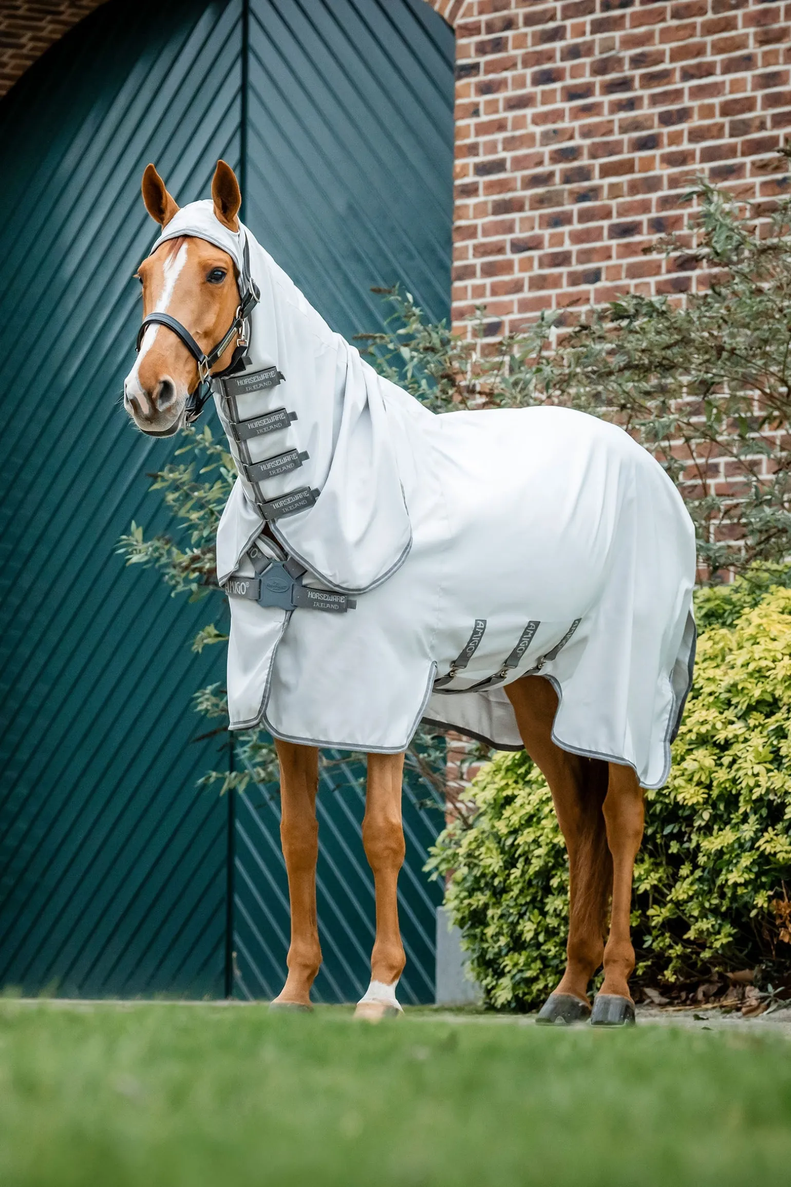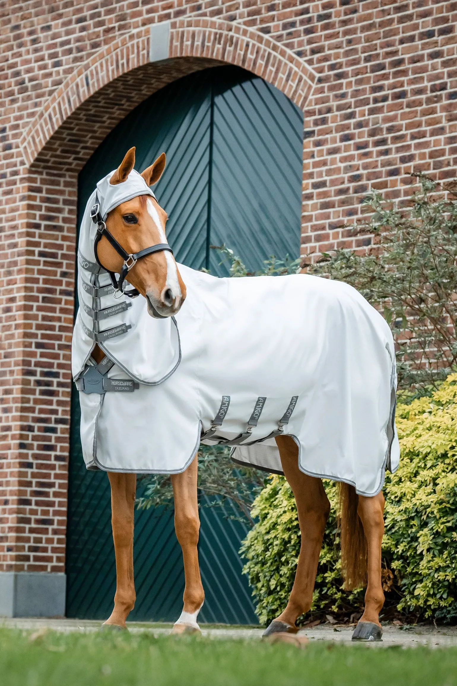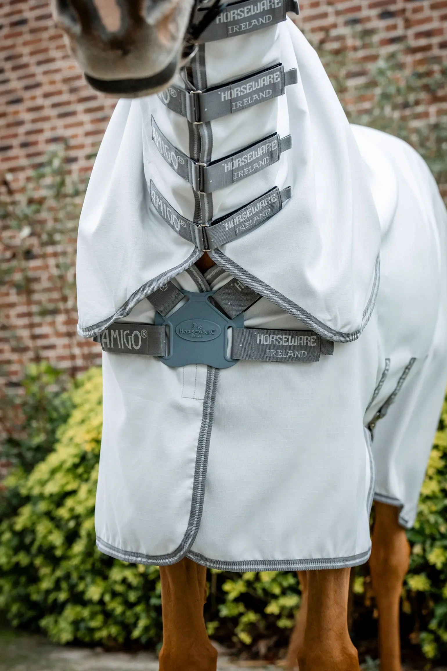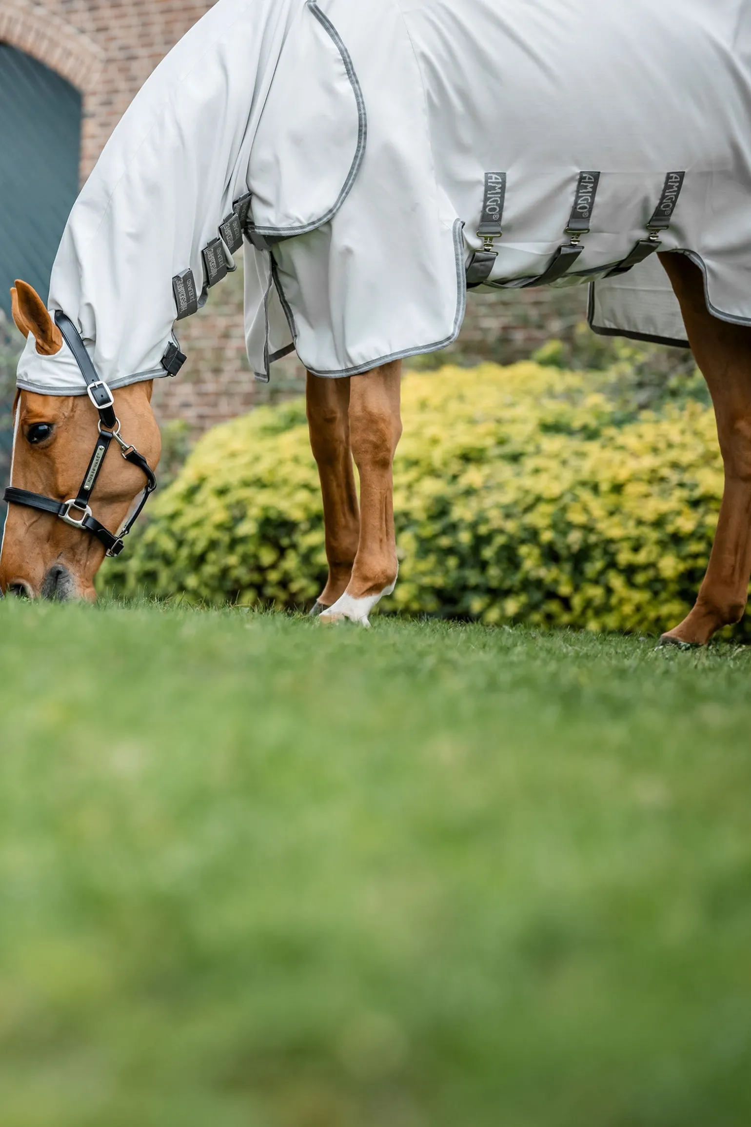 Die Amigo® Ripstop Halsteil-Weidedecke von Horseware ist dein sommerlicher Superheld und schützt dein Pferd vor lästigen Hautreizungen sowie vor UV-Strahlen. Sie gibt dir ein gutes Gefühl bei der Wahl deiner Decke. Mit den bewährten Amigo®-Komfortdetails ausgestattet, darunter ein leichtes Disc-Front-Verschluss-System für sicheres und einfaches Anlegen ohne Scheuern, eine seidige Abdeckung für Mähne, Schulter und Schweif zur Minimierung von Reibung sowie vordere Beinausschnitte für mehr Bewegungsfreiheit auf der Weide oder unterwegs. Die Kreuzgurte sorgen für einen festen Sitz, während die extra große Schweifklappe die pflegeleichte, PVC-beschichtete Schweifkordel schützt. Einfach anzulegen, einfach zu pflegen! Die Außenseite aus dicht gewebtem 600D Ripstop-Polyester verfügt über ein integriertes Halsteil, das kontinuierlichen Schutz vor Insekten und Sonne bietet. Befestigungsösen machen die Decke kompatibel mit der wasserdichten Horseware®-Einlage und bieten dir so mehrere Deckenkombinationen mit nur einer äußeren Decke!