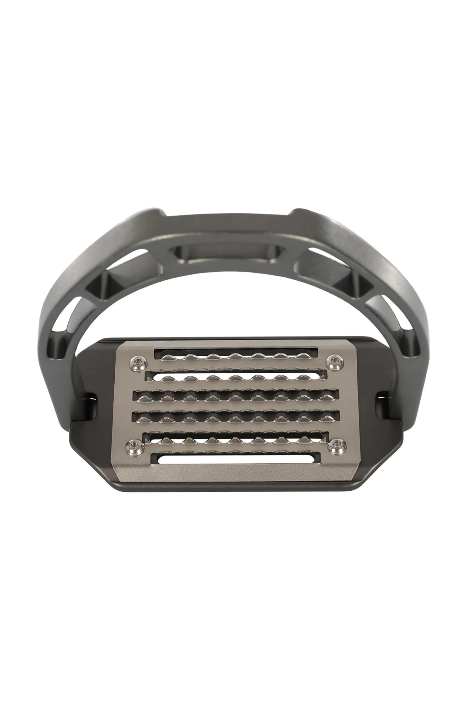 Die Trittfläche ist aus rostfreiem Stahl und hat lange horizontale Löcher. Die 5° Neigung hilft den Reitern, die richtige Haltung einzunehmen und entlastet Knöchel, Waden, Knie und Hüfte.