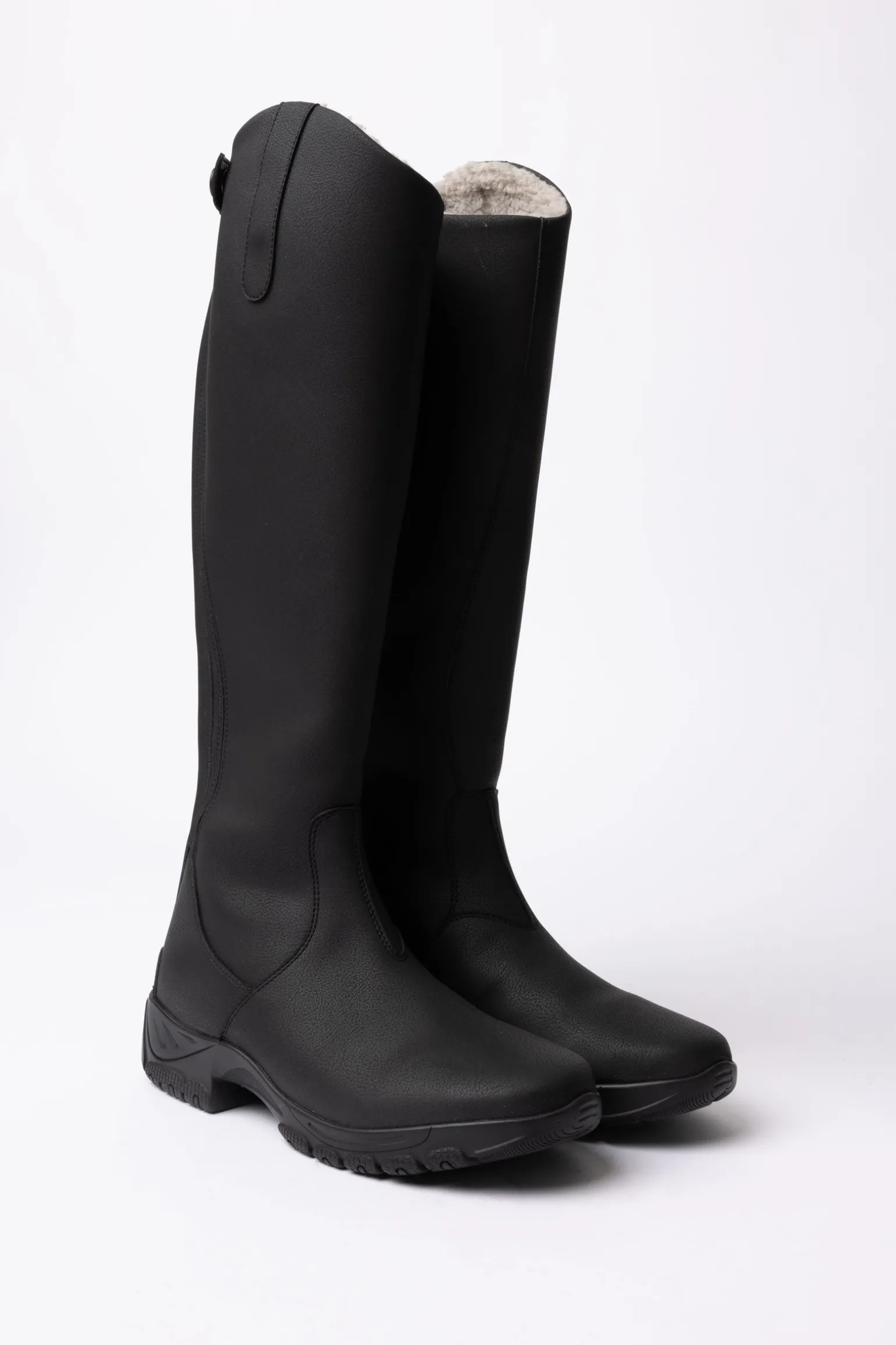 Reitstiefel aus PU-Leder mit Kunstfellfutter, elastischen Einsätzen und rutschfester Sohle.