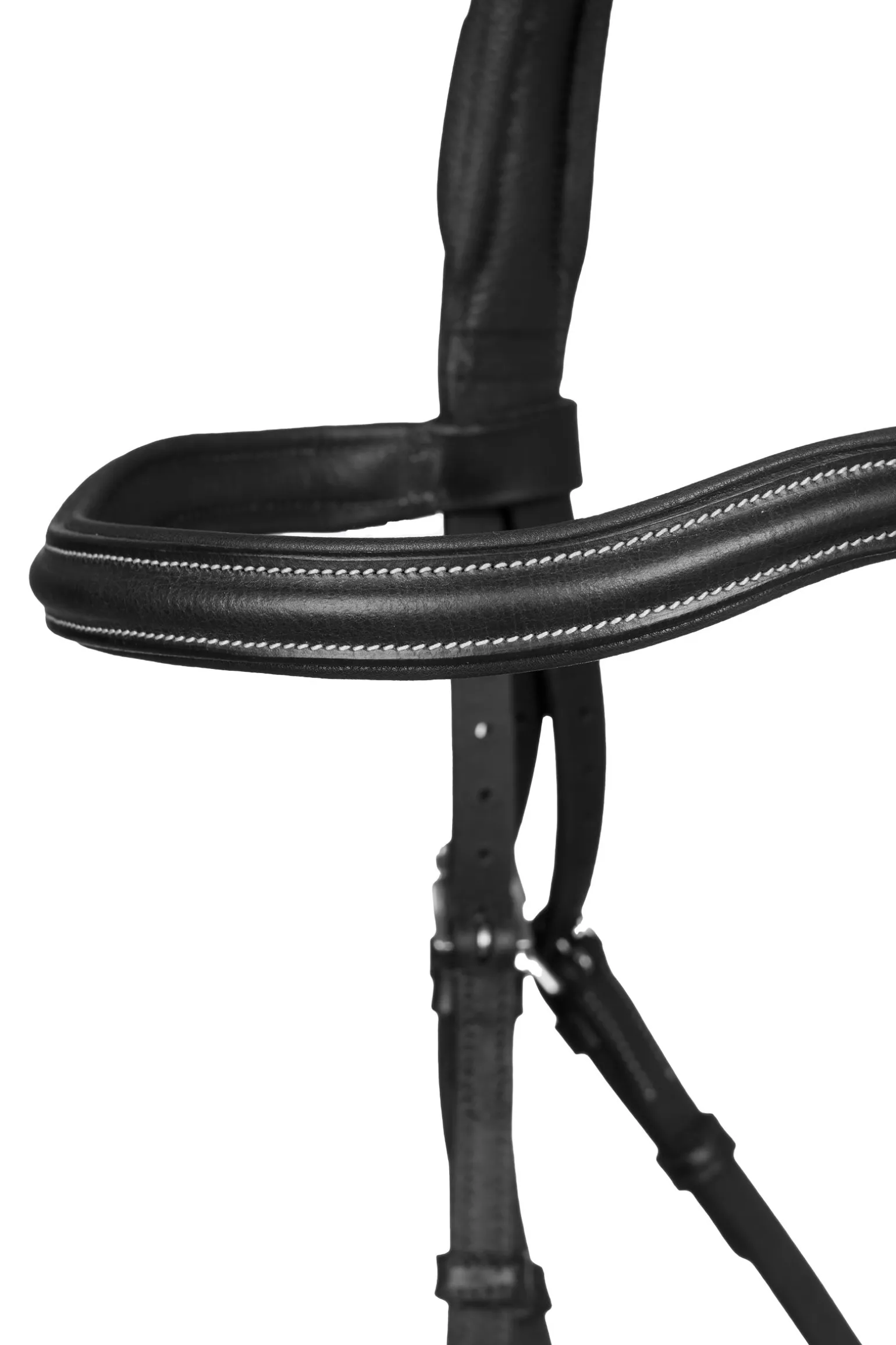 Dieses Zaumzeug wurde entwickelt, um den Komfort für dein Pferd zu maximieren und den Druck gleichmäßig über Nase und Backen zu verteilen – mit viel Platz im Nüsternbereich für freie Atmung. Die leicht gepolsterte, anatomisch geformte Trense mit Stirnriemen sorgt für angenehmen Sitz und sanfte Druckverteilung. Das tiefsitzende Reithalfter verläuft unterhalb des Gebisses und wirkt ähnlich wie ein hannoversches Reithalfter. Das weich gepolsterte Genickstück entlastet den Druck hinter den Ohren und auf dem Genick.