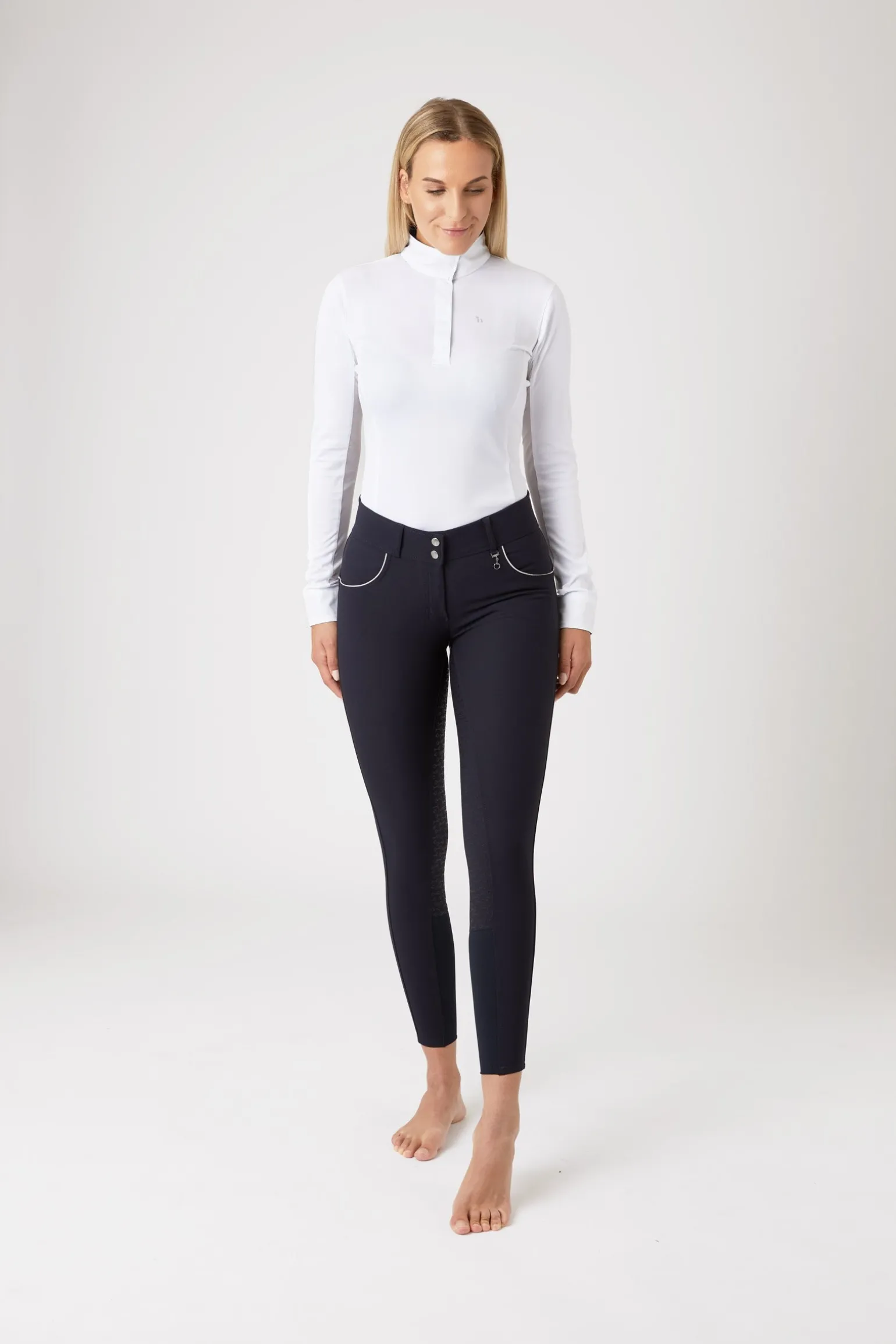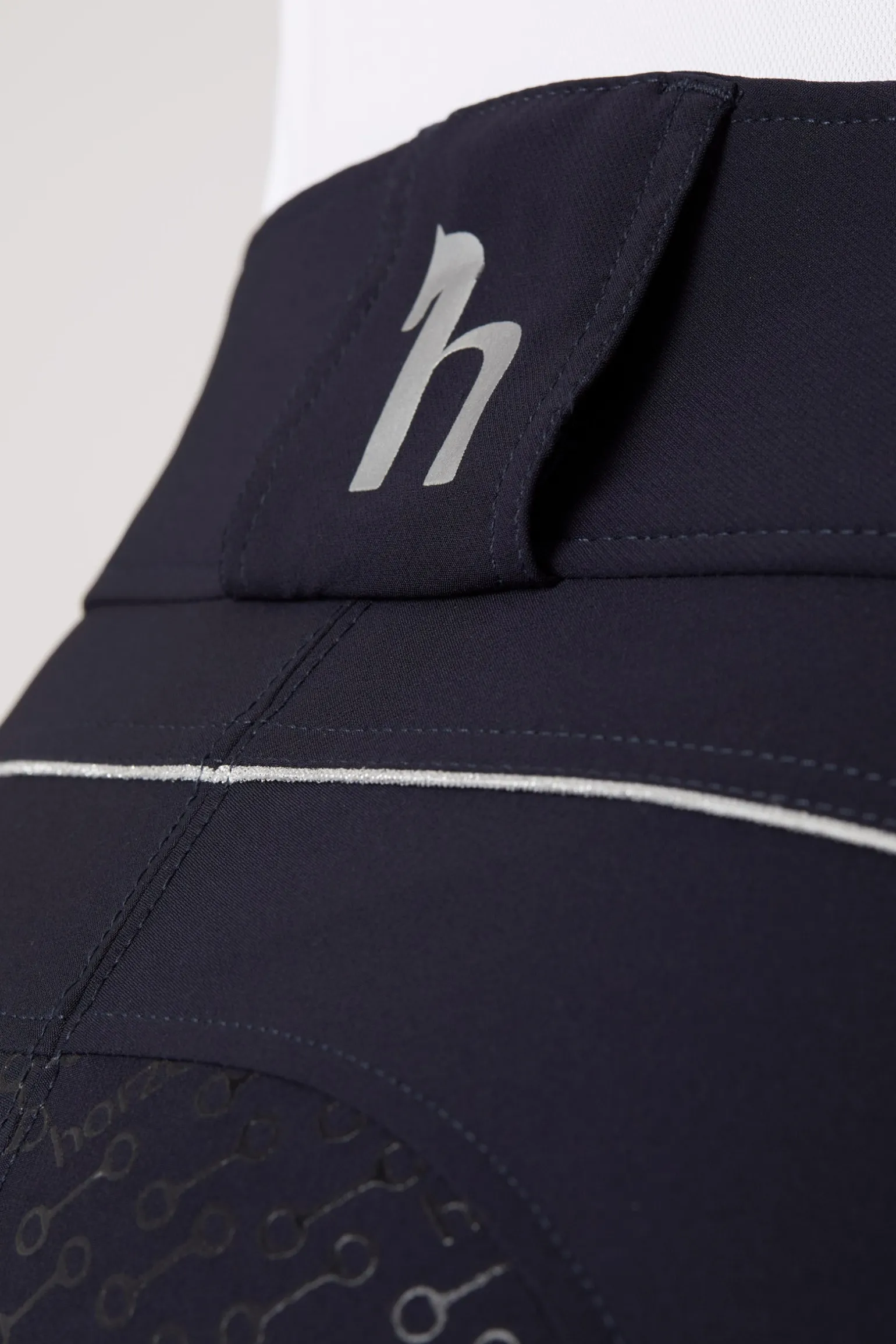 Die Horze Aubrey Reithose verfügt über einen Silikonvollbesatz, der für den idealen Halt im Sattel sorgt. Ein hoher Bund bietet die ideale Unterstützung für deinen Bauch und Rücken. Elegante Kontraststreifen und der Logoprint liefern bezaubernde Details.