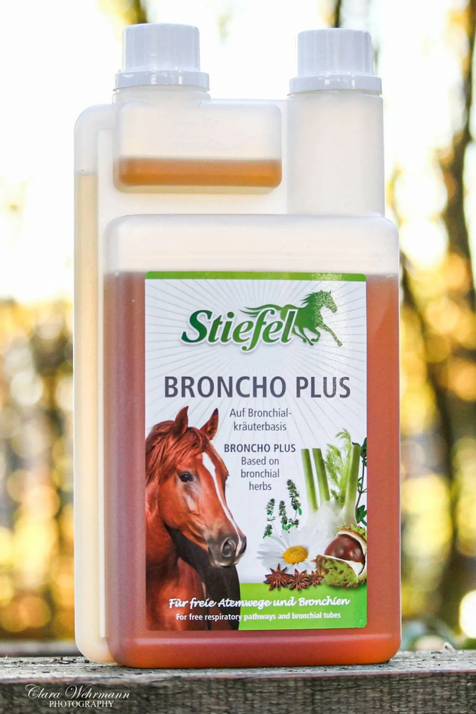 Stiefel Broncho Plus ist ein flüssiges Bronchialelixier zur Stärkung, Beruhigung und Unterstützung der Atemwege. Die konzentrierten Kräuterauszüge können Atemwege und Bronchien bei haltungs- und fütterungsbedingter Beanspruchung unterstützen und sich positiv auf die Abwehrkräfte auswirken. Fütterungshinweis: Großpferde (600 kg KGW): vorbeugend 30– 45ml / tägl., akut 60 – 100 ml / tägl. Kleinpferde: vorbeugend 15 – 25 ml / tägl., akut 30 – 50 ml / tägl. Tipp: Zur Ganzjahresfütterung eignen sich auch Stiefel Hustenkräuter.