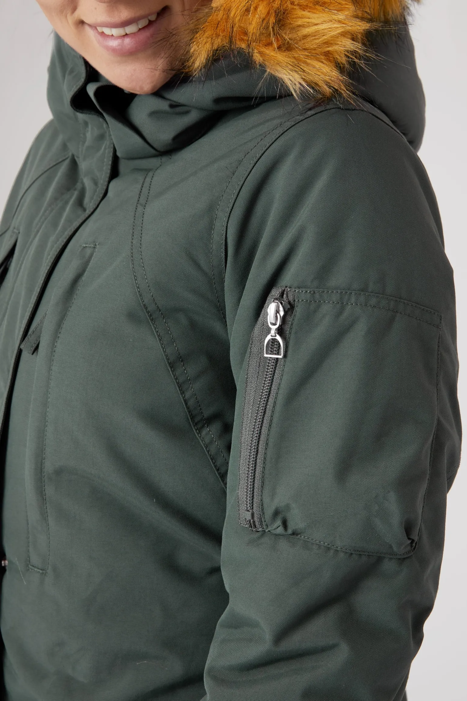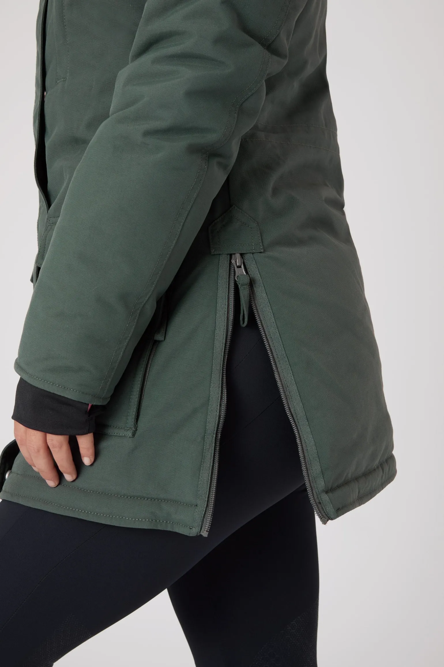Wähle diesen sportlichen, langen Damen-Parka für viel Wärme mit Funktion und Langlebigkeit. Die Jacke ist warm, wasser- und winddicht für jede Art von Winterwetter geeignet. Der 2-Wege-Reißverschluss und die seitlichen Öffnungen mit Reißverschluss sind nur einige der praktischen Details. Viele Taschen und eine abnehmbare Kapuze mit Einfassung aus Kunstpelz machen die Jacke zu einem bemerkenswerten Mantel. Die langen Bündchen können beim Reiten über die Hände gezogen werden, um für noch mehr Wärme zu sorgen.