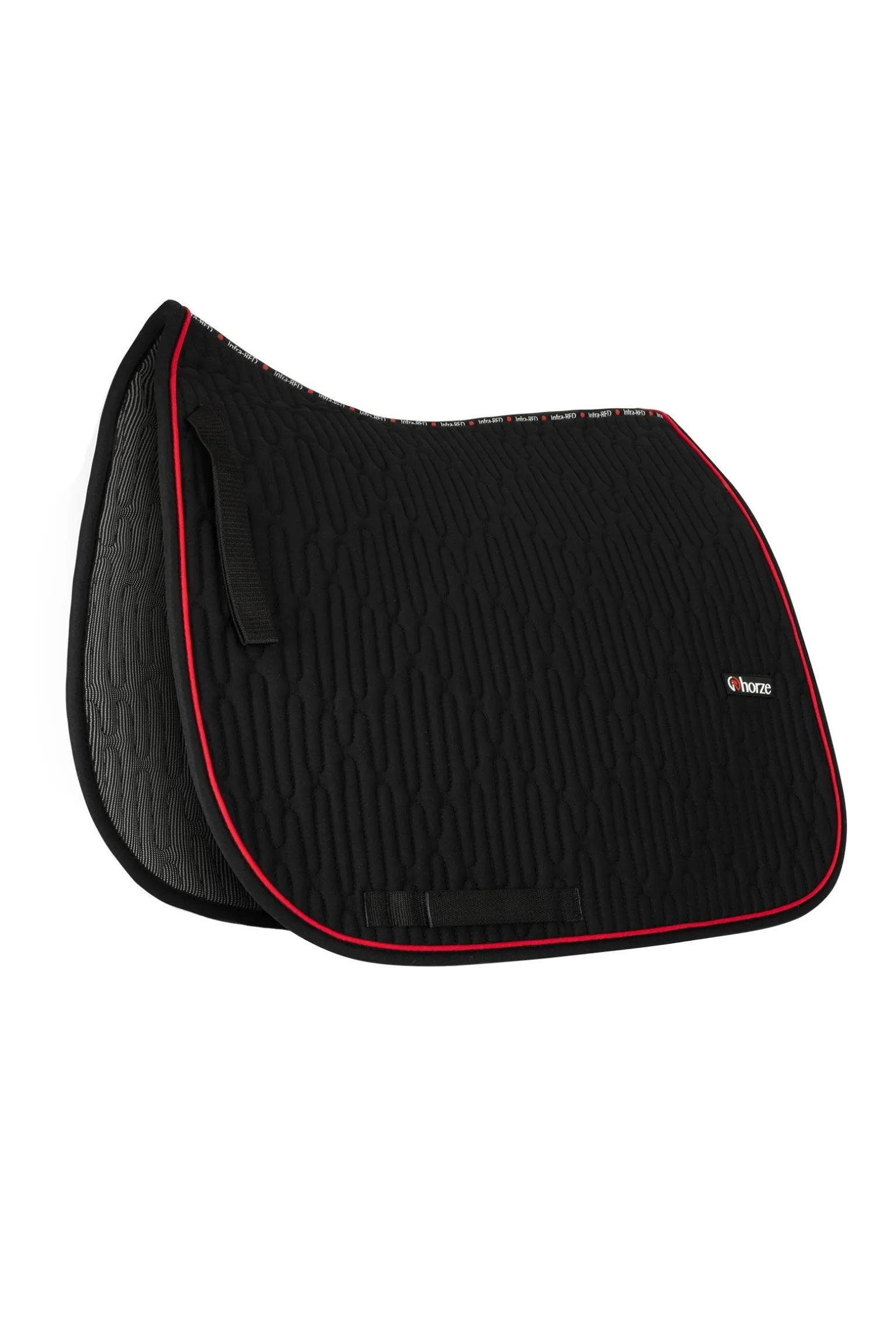Mesh entlang der Wirbelsäule erhöht die Atmungsaktivität unter dem Sattel, was bei schweißtreibenden Trainingseinheiten oder an heißen Sommertagen sehr praktisch ist. Kurze D-Ring-Befestigungen mit Elastik und zu öffnende Gurtbändern halten den Sattel sicher an seinem Platz. Rote Paspeln und Logotape entlang des Mesheinsatzes kennzeichnen diese Schabracke als Teil der Horze Cairo Kollektion.
