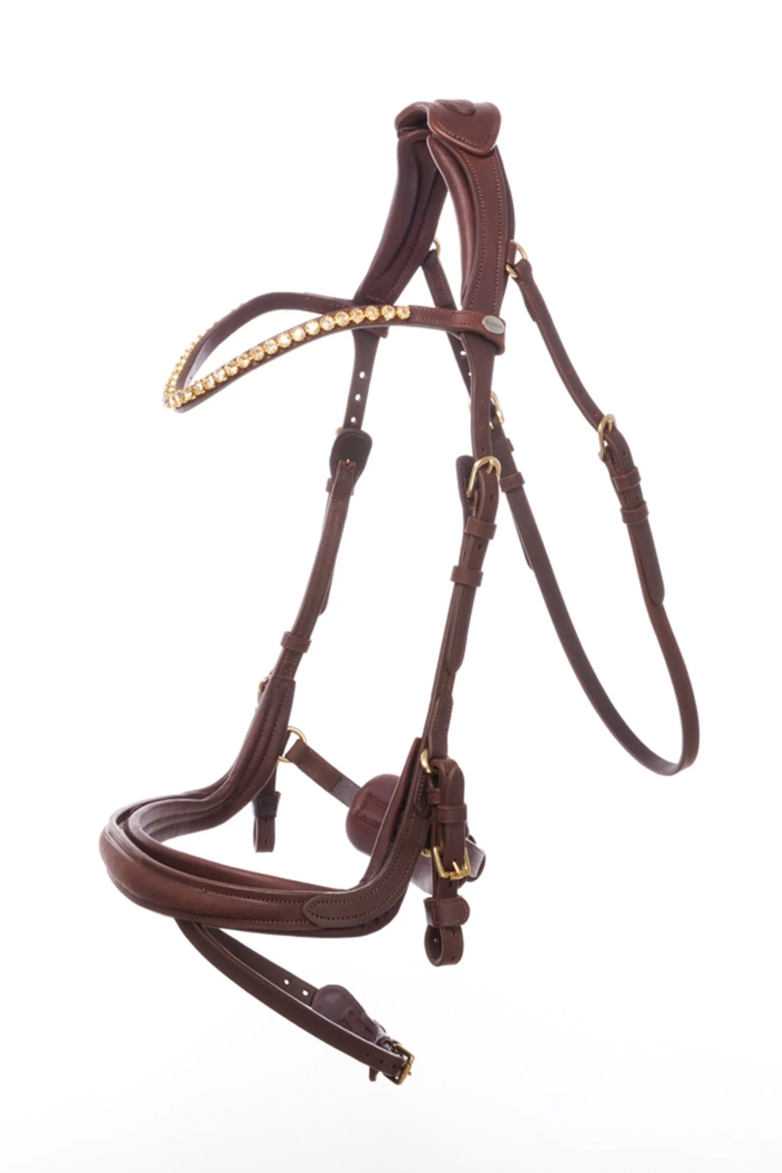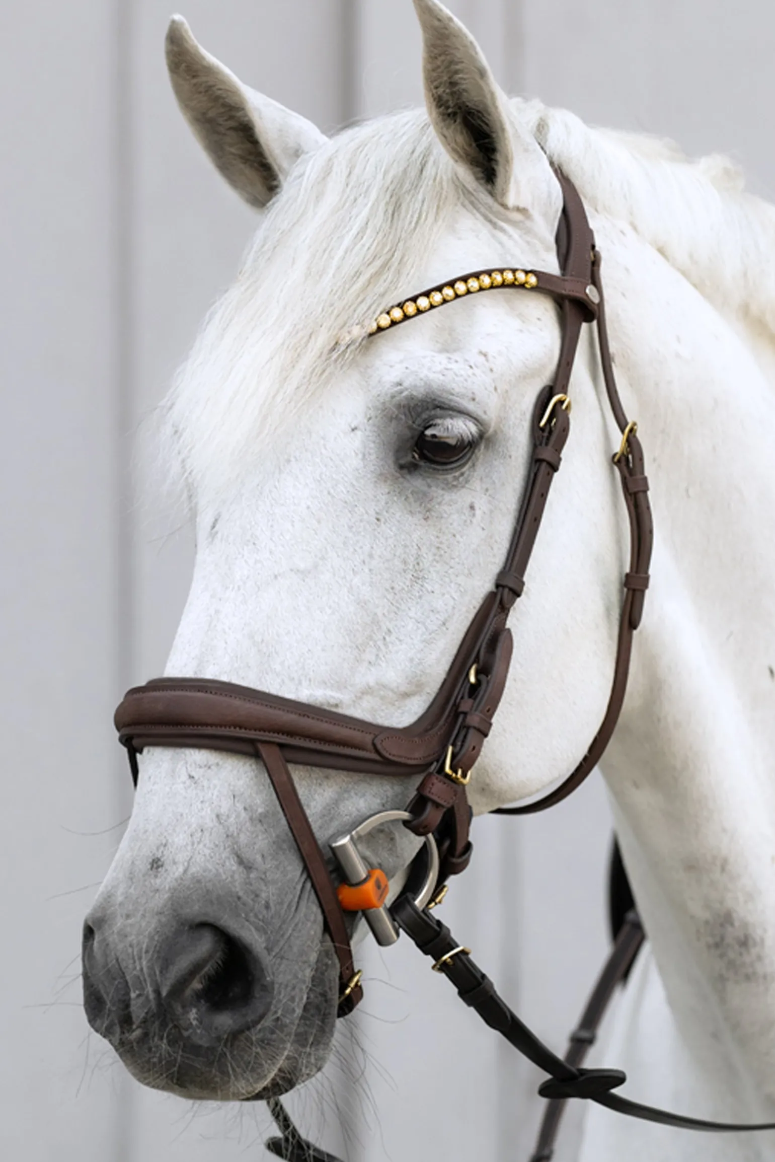 Die Dressurtrense „Caliano“ besteht aus hochwertigem deutschen Qualitätsleder sowie einem besonders weichen Genickstück, welches stark anatomisch geformt ist mit Einschnitt. Die weiche Polsterung vom Nasenriemen und Stirnband bieten ebenfalls einen besonderen Komfort für das Pferd. Das Reithalfter ist beidseitig verstellbar. Der Trensenzaum wird ohne Zügel geliefert.