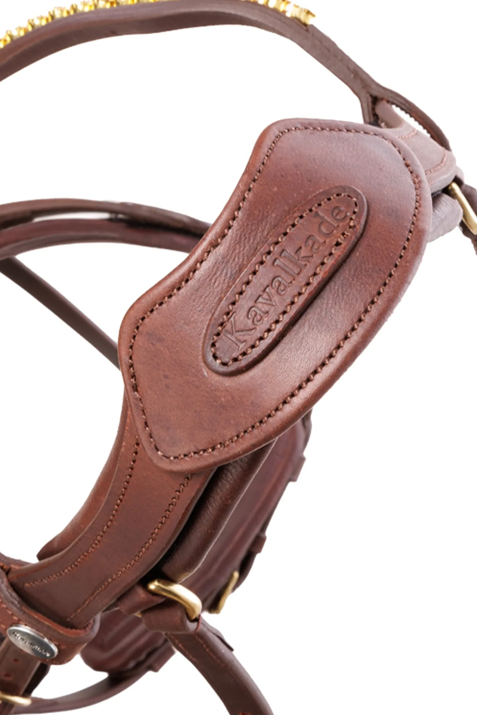 Bei Trensen mit dem Zusatz KavalSH4 ist der Sperrriemen abnehmbar. Das Besondere daran ist, dass die Halterung für den Sperrriemen nicht, wie bei herkömmlichen Trensen mit abnehmbarem Sperrriemen, ersichtlich ist.