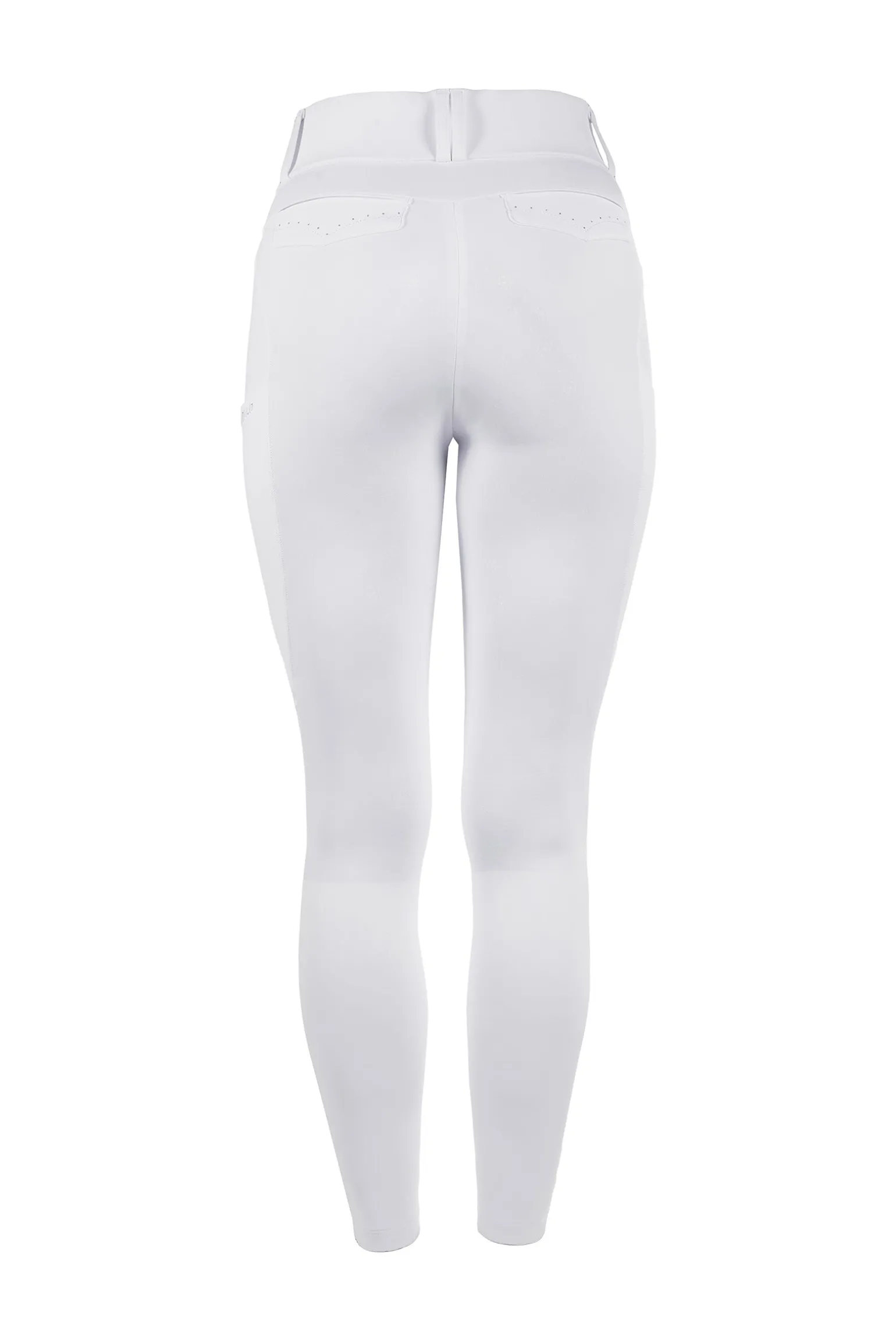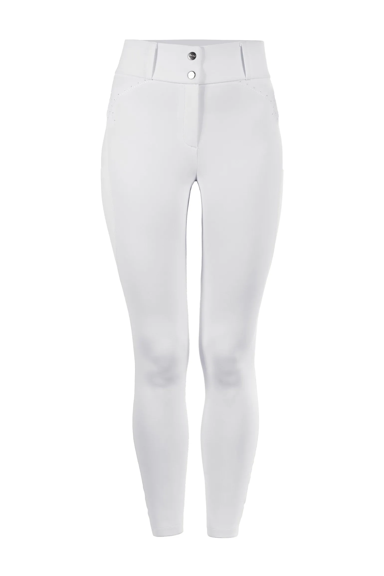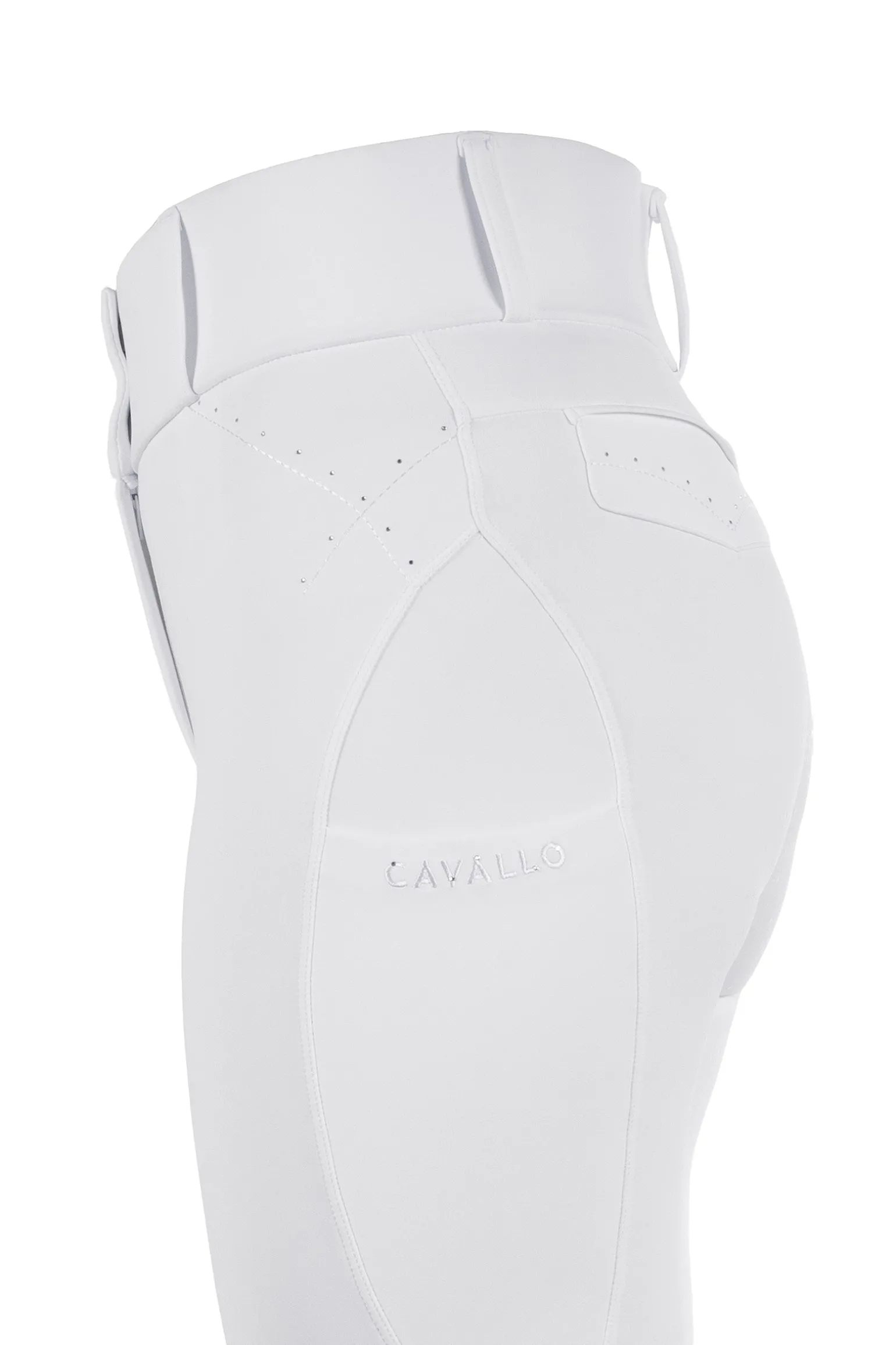 Diese bequemen Reitleggings vereinen den klassischen Look von Reithosen mit glitzernden Details für einen stilvollen Twist. Sie verfügen über Handytaschen mit feiner Cavallo-Stickerei, die nahtlos in die Nähte an den Seiten der Oberschenkel integriert sind, sowie ein Rückenteil mit zwei dekorativen Klappen, die mit Stickerei und Strasssteinen verziert sind. Der breite Bund mit Gürtelschlaufen sorgt für eine perfekte, sichere Passform und macht sie zu einem Must-have für deinen Reitkleiderschrank.