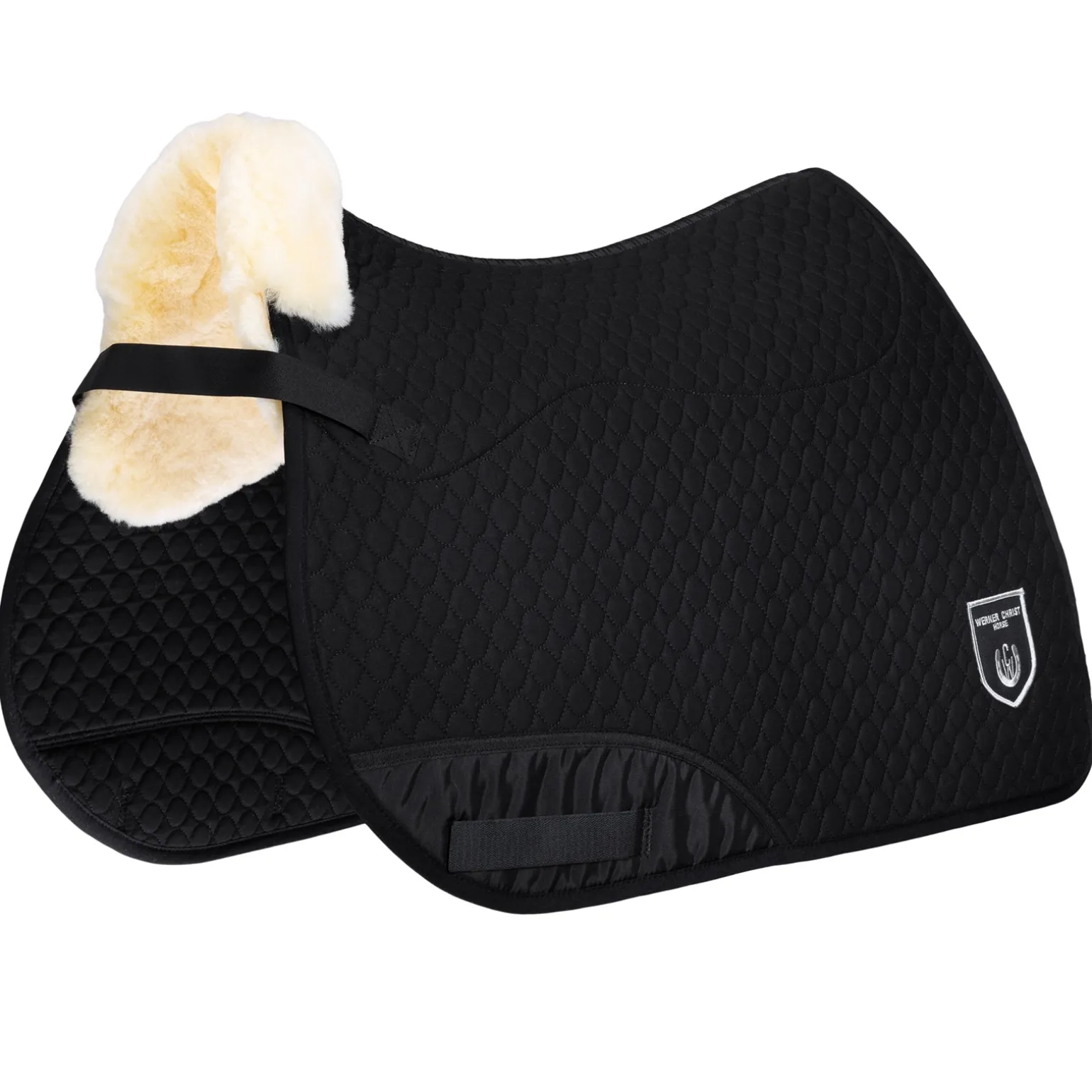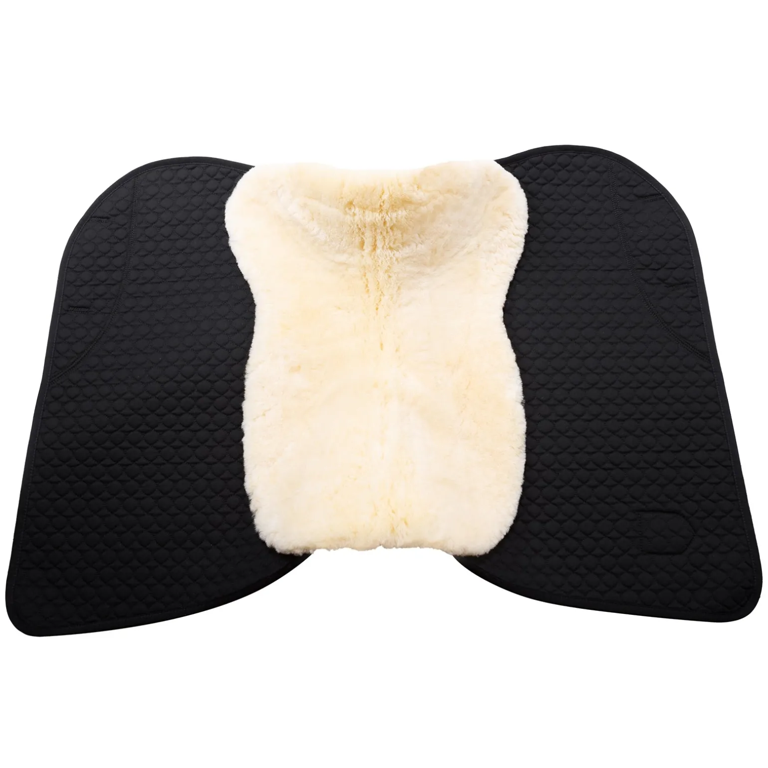 Die Unterseite besteht aus echtem Lammfell mit ca. 30 mm Wollhöhe. Der Blattbereich bleibt frei. Die Befestigung erfolgt mit Klettstrupfen an den Gurtriemen des Sattels und durch eine Gurtführung am Blattende. Der eingearbeitete Nylonschutz verhindert das Aufscheuern im Bereich der Sattelgurtung. Vorne wird das Lammfell bis auf die Oberseite herumgezogen und dient als Sattelanlage.