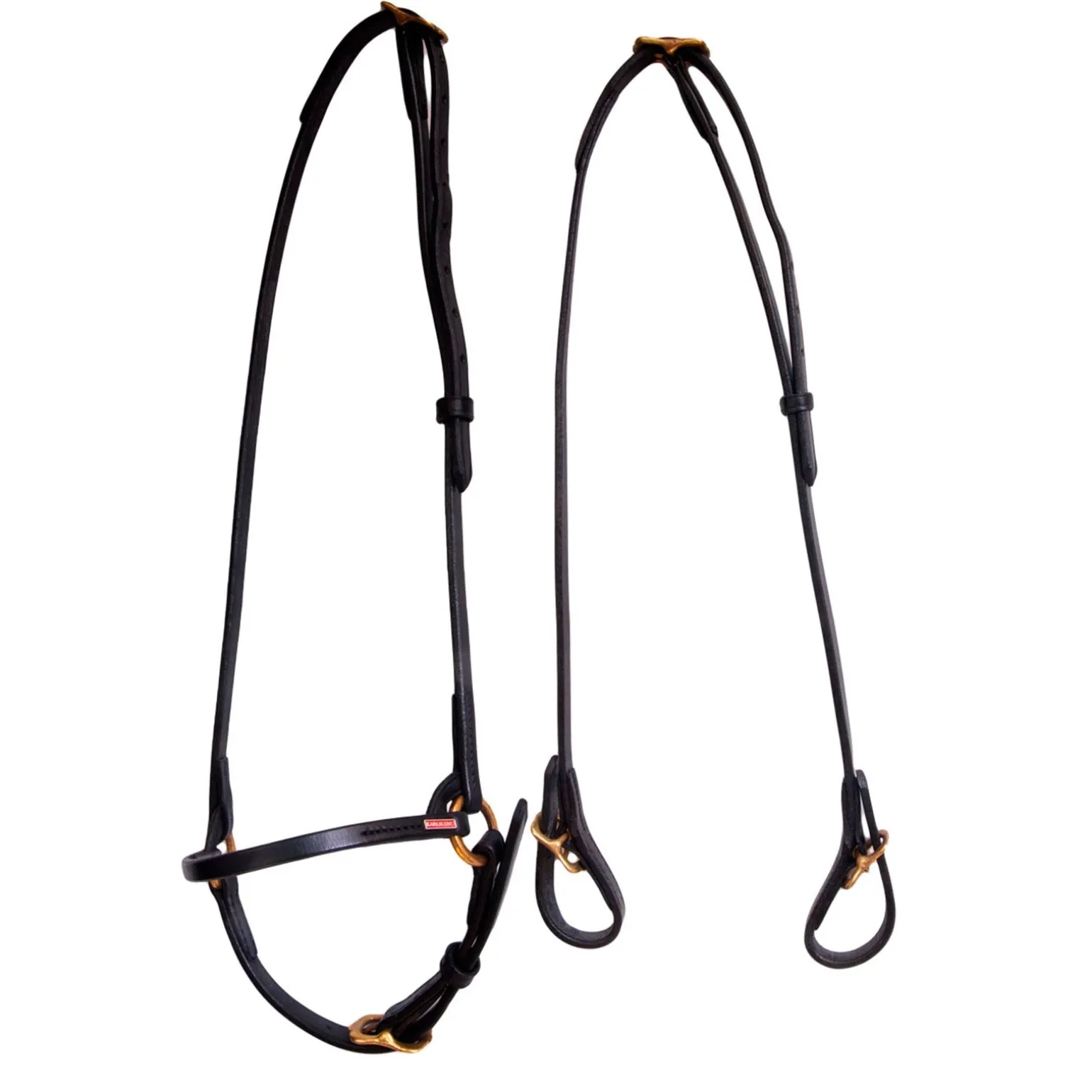 Kompletter, schmaler Zaum aus schwarzem oder braunem Leder mit Messingbeschlägen. Eleganter und minimalistischer Stil.