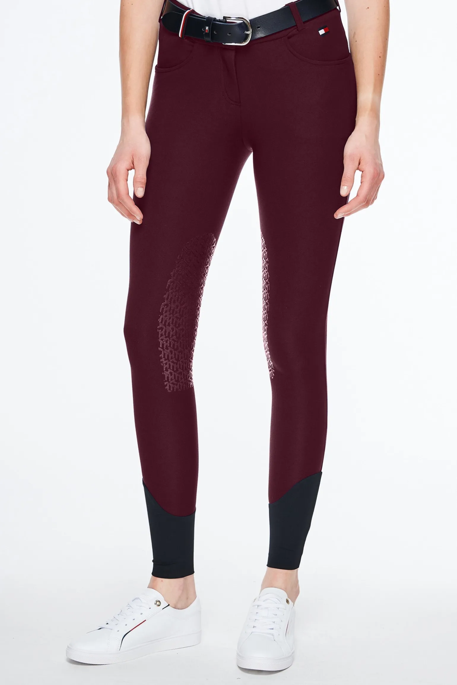 All-Season Kneegrip Reithose von Tommy Hilfiger mit zwei Jeans Taschen vorne und zwei Attrappen-Klappentaschen mit Knopf hinten. Die Reithose besitzt einen Beinabschluss aus elastischem Jersey für einen bequemen Einstieg und einen Bund Verschluss vorne mit Haken und zusätzlichem Safety-Button. Es gibt eine Logo Stickerei vorne seitlich unterhalb des Bundes, sowie eine TH Global Stripe Applikation auf einer Gurtschlaufe vorne und auf den zwei Mittleren hinten.