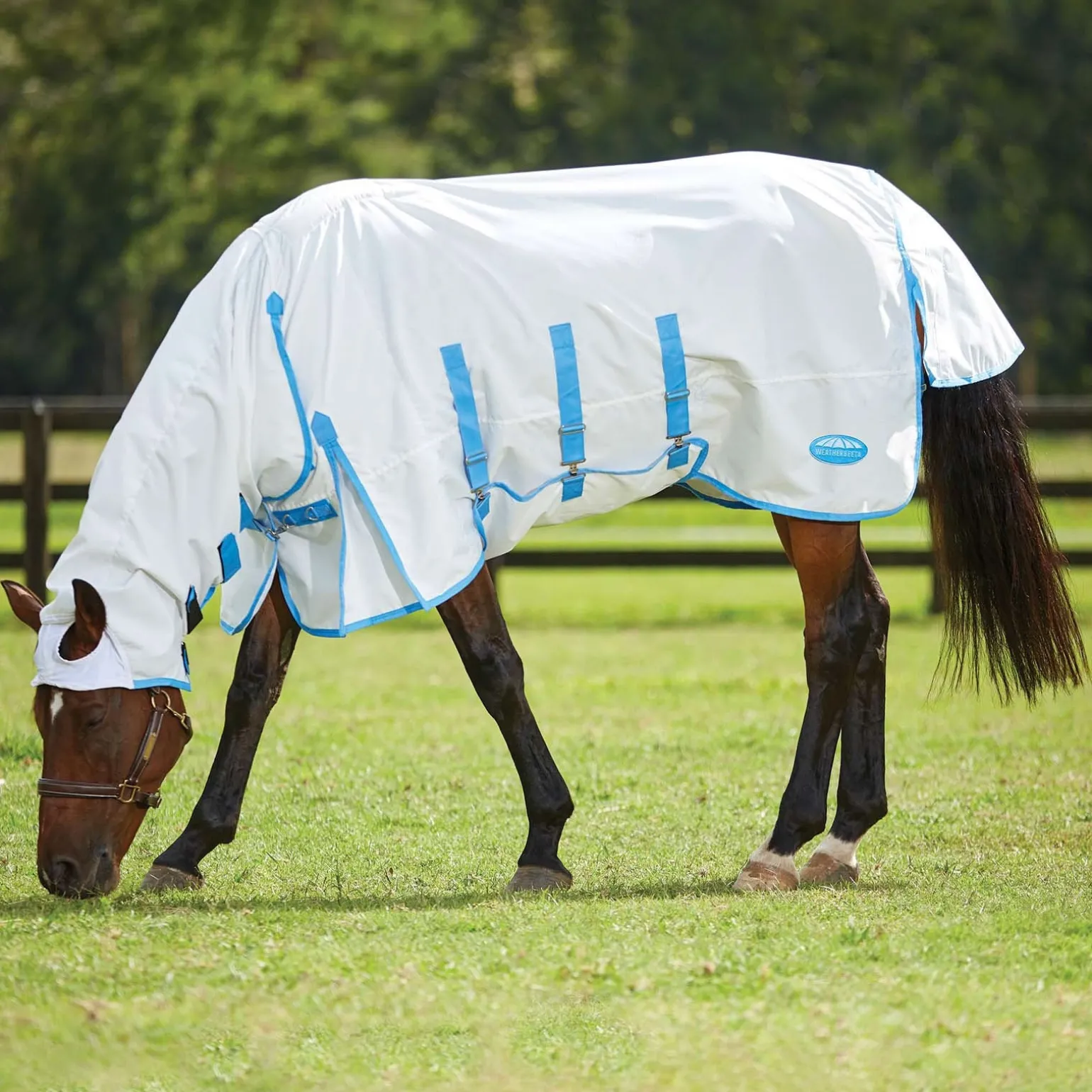 Die WeatherBeeta Sweet Itch Shield Fixed Neck schützt empfindliche Pferde von Kopf bis Schweif. Sie bietet Schutz vor UV-Strahlen, Sonnenbleiche, Parasiten und Insekten und vermeidet Reizungen und Hautallergien wie Sommerekzeme. Hergestellt aus einem starken 600 Denier Ripstop-Außenmaterial, das hoch atmungsaktiv ist, mit gefütterten Schultern, um Reibung und Dehnung zu verhindern, elastischem, verstellbarem Bauchschutz und Schweiflatz für ultimativen Schutz mit Fliegenhaube mit elastischem Einsatz um die Ohren, um sicherzustellen, dass der Halsbereich der Decke an Ort und Stelle bleibt, für vollständigen Schutz und zusätzlichen Komfort. Ausgestattet mit einem Widerristrelief für zusätzlichen Komfort und zur Verringerung von Reibung, traditioneller Gehfalte für natürliche Bewegung, Ezi-Clip-Frontverschluss mit Touch-Tape, der schnell und einfach zu bedienen ist, und Schweifkordel. Bietet 90%+ UV-Schutz.