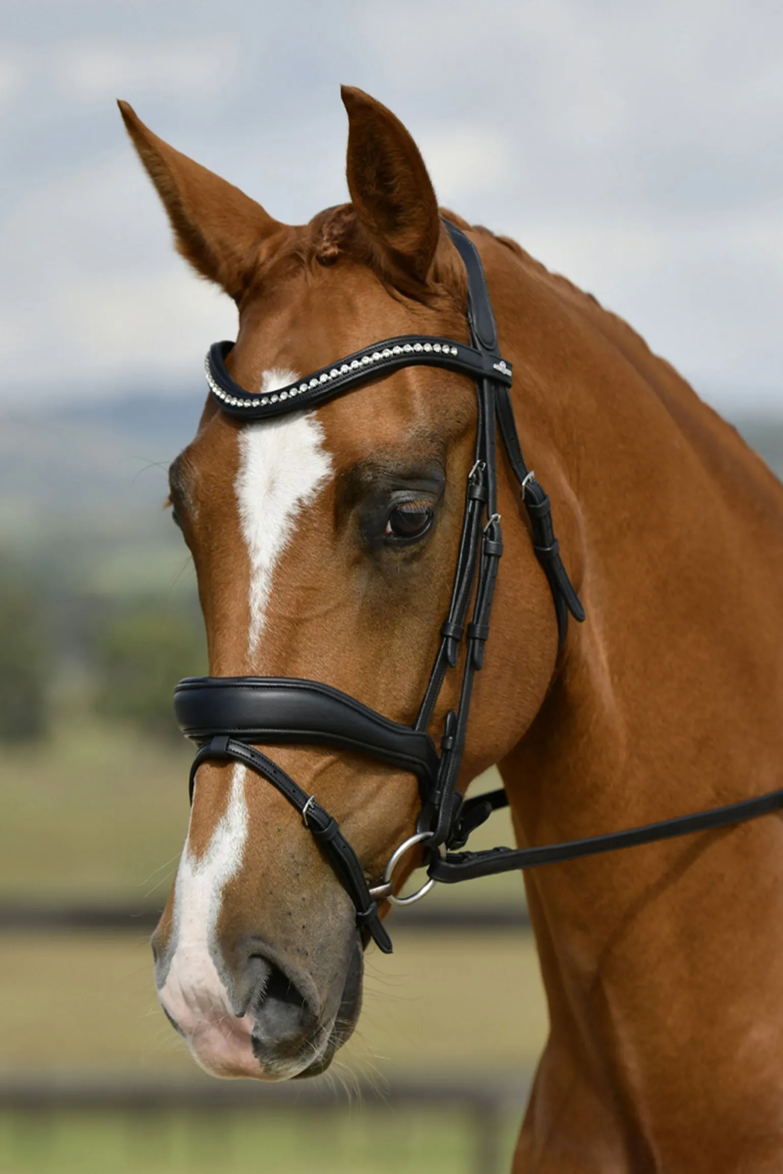 Diese Dressurtrense wird aus feinstem europäisch und indisch gegerbtem Leder gefertigt und fühlt sich besonders weich und geschmeidig an – für optimalen Komfort deines Pferdes. Du hast die Wahl zwischen zwei Stirnriemen: einem schlichten, geschwungenen Lederstirnriemen für das tägliche Training und einem atemberaubenden Modell mit Kristalldetails für den großen Auftritt im Viereck. Das anatomisch geformte Kopfstück ist weich gepolstert und im Genick breiter geschnitten, um den Druck gleichmäßig und angenehm zu verteilen. Der abnehmbare Blitzriemen lässt sich in ein einfaches Kappzaum-Nasenband umwandeln. Robuste Beschläge aus rostfreiem Stahl, ein gepolstertes Kurbelriemenband und verstellbare Schnallen an Nasen- und Kehlriemen auf beiden Seiten sorgen für die perfekte Passform. Die passenden Zügel sind separat erhältlich.