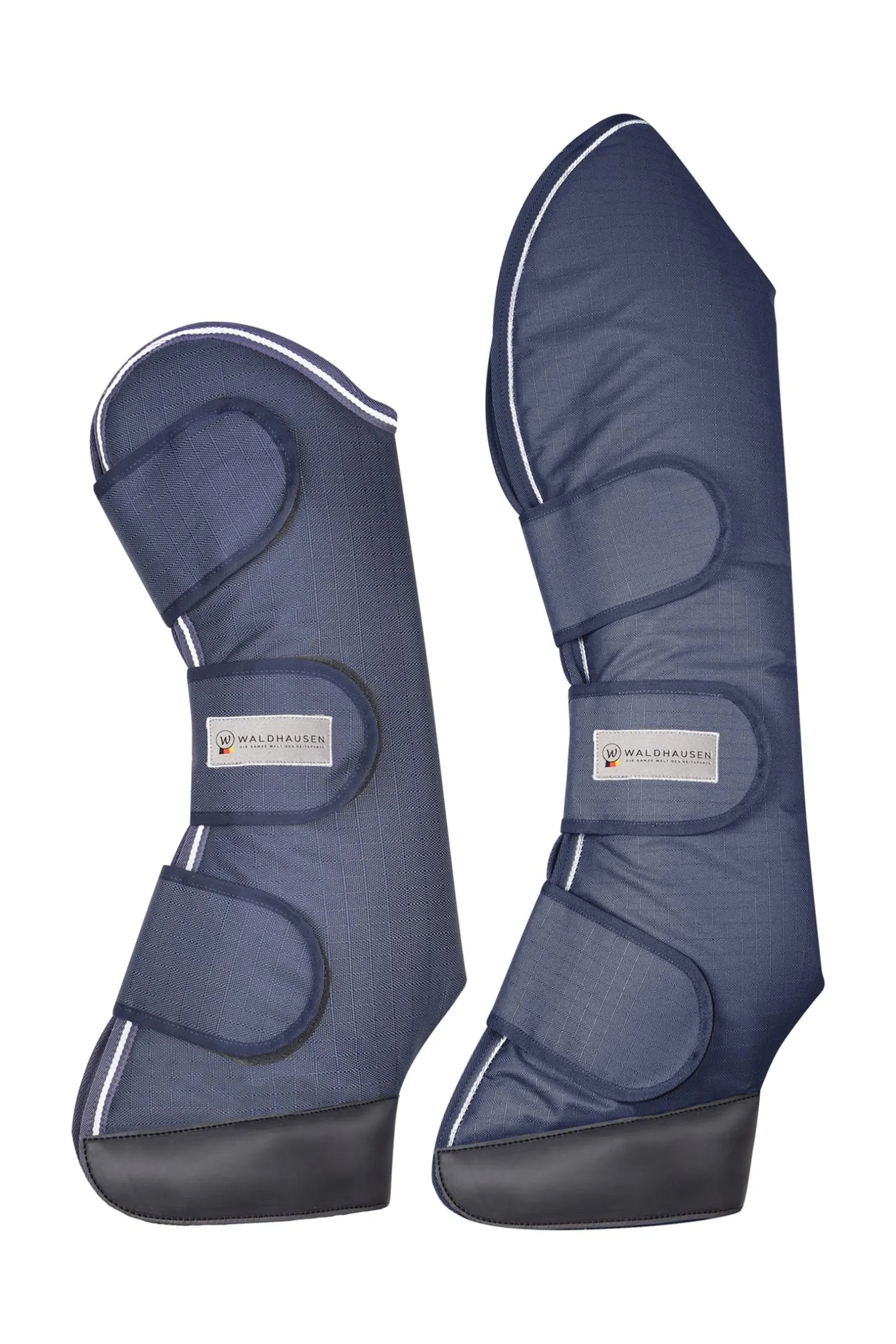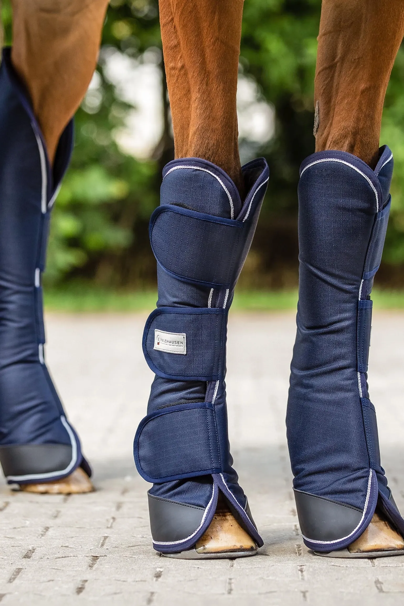 Anatomisch geformte Transportgamaschen mit drei starken Klettverschlüssen für optimalen Halt am Pferdebein. Hoher Schutz dank stoßdämpfender Schaumstoffpolsterung (1,5 cm dick) im Inneren und hohem Schnitt. Weiches Fleecefutter für maximalen Komfort. Besonders strapazierfähiges Außenmaterial mit Verstärkung im Fersenbereich.