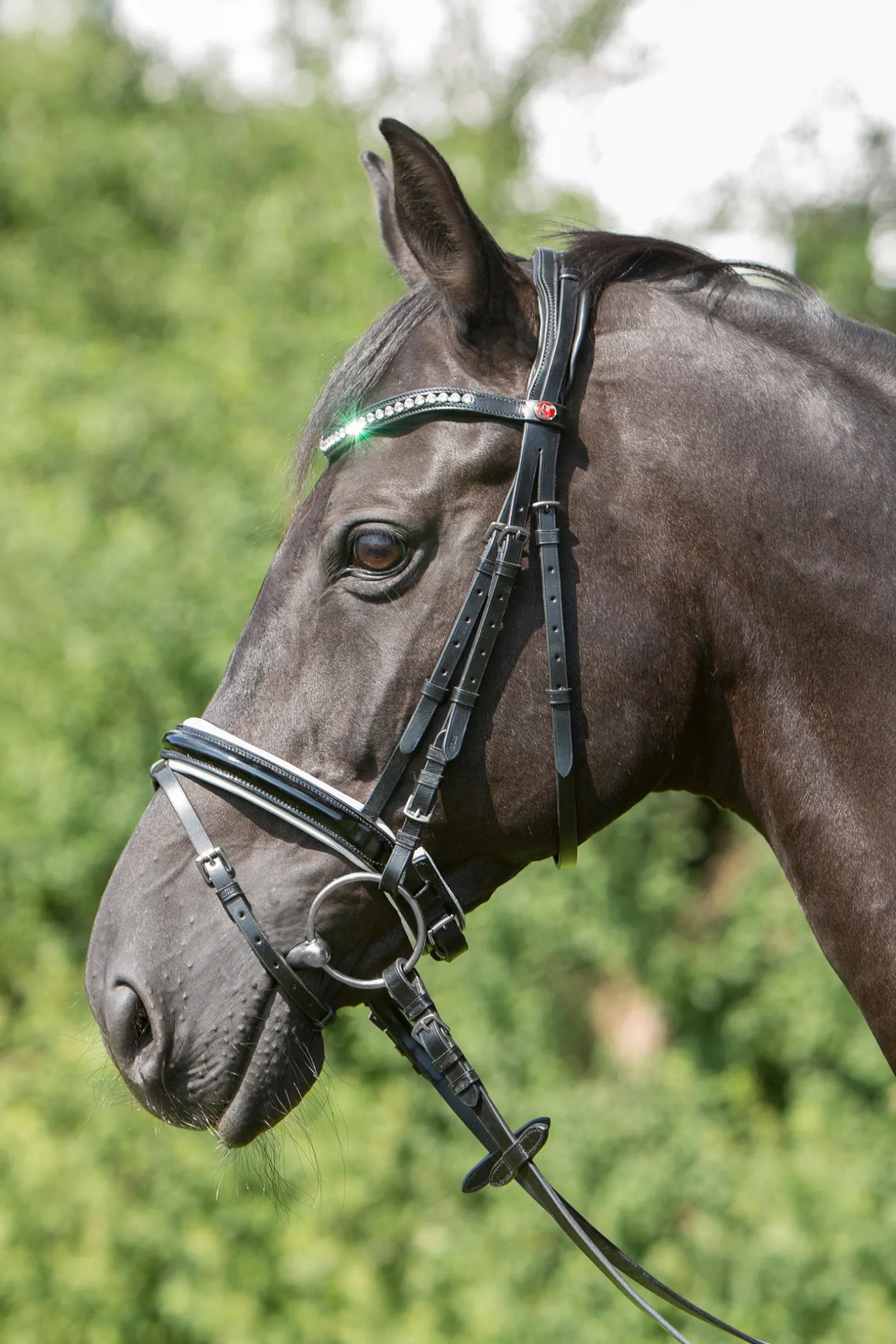 Luxuriöse, englisch kombinierte Trense mit Lack-Reithalfter.