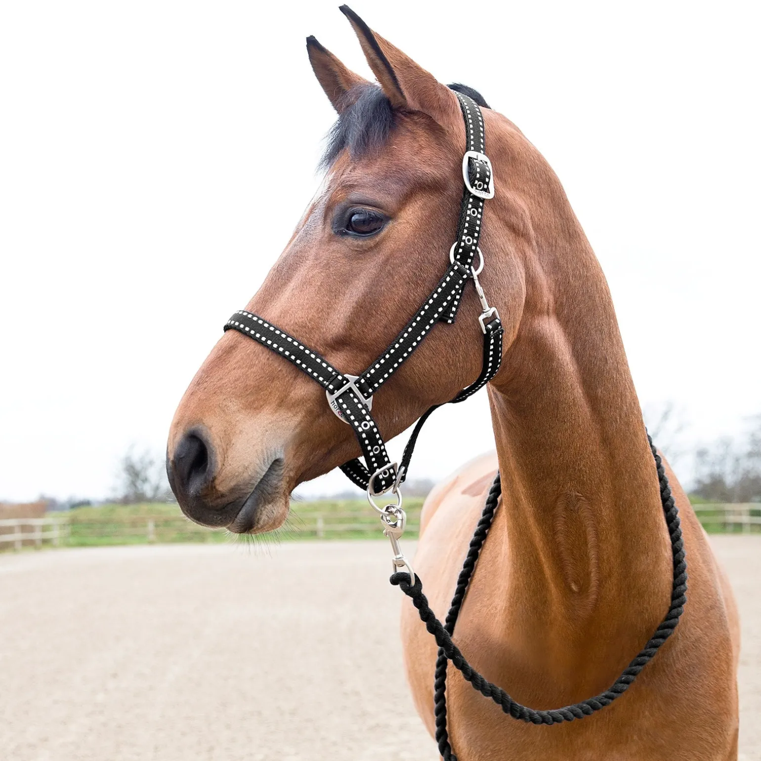 Das Halfter und Führstrick Set hat ein gestricheltes Design auf dem weichen Gewebe und starke Chromschnallen für eine klare Optik. Der einfache Verschluss an dem weichen Baumwollseil ist vielseitig einsetzbar und rundet dieses Set ab. Das Halfter hat einen leicht verstellbaren Nasenriemen und Genickriemen für eine ausgezeichnete Passform.
