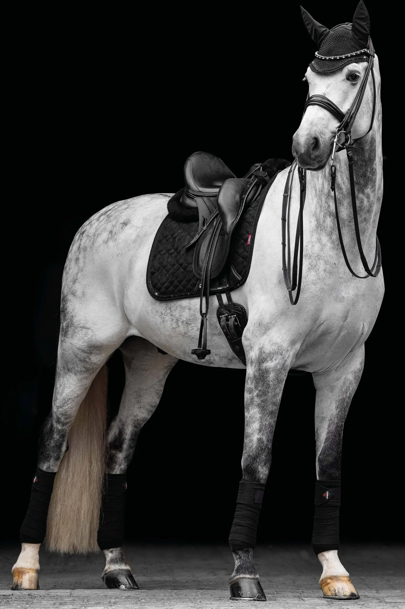 Die Crystal Suede Close Contact Schabracke von LeMieux hat eine luxuriös weiche Wildlederoberfläche und ein neues, raffiniertes Steppmuster, das deinem Sattel einen eleganten und professionellen Look verleiht. Für einen ganz besonderen Touch hat LeMieux diese Schabracke mit glitzernden und geflochtenen Details veredelt, um einen wunderschönen Look zu kreieren, der sich sehen lassen kann.