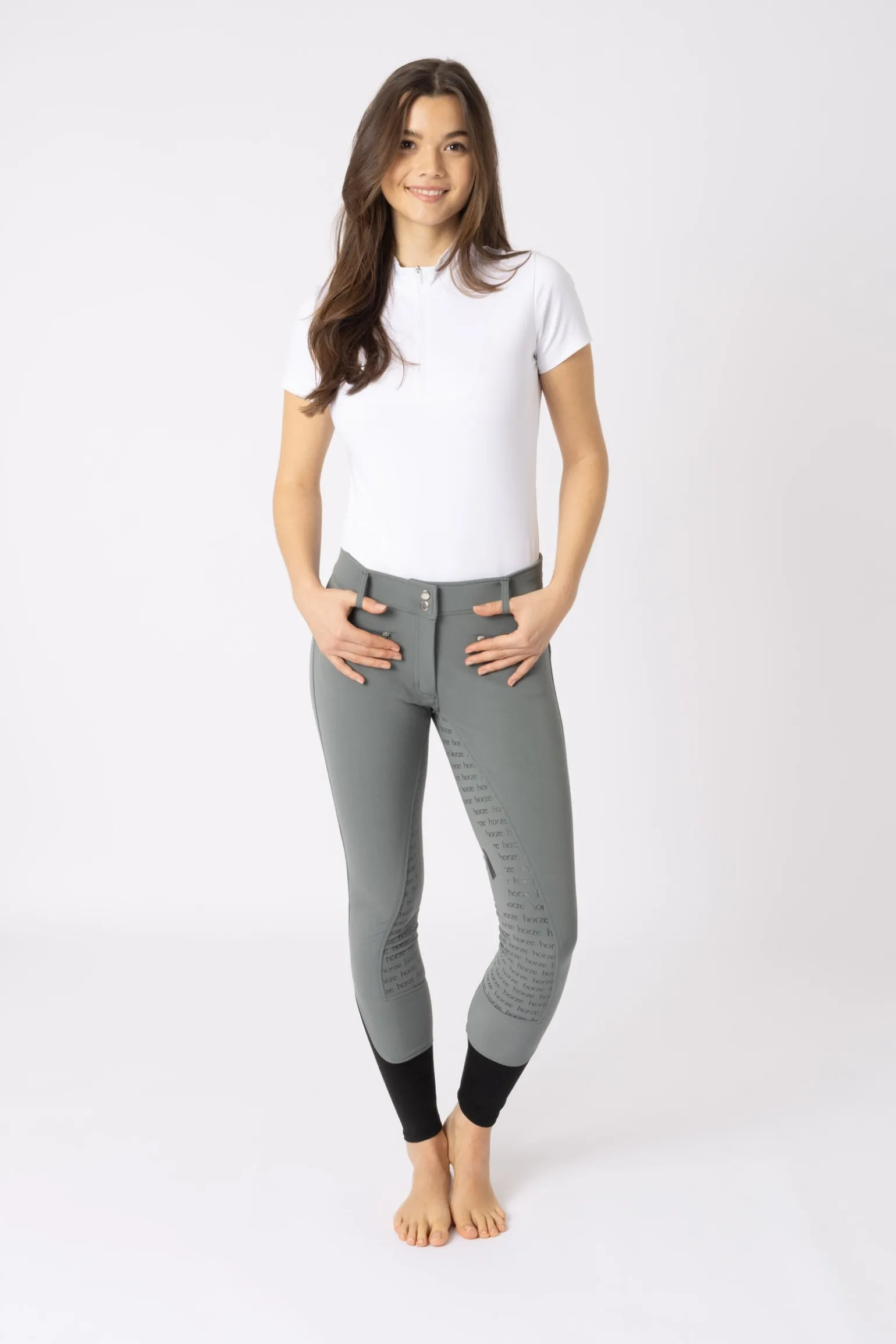 Ein schöner hoher Bund mit kreuzförmiger Gürtelschlaufe macht diese Damenreithose zu einer guten Wahl für bequemes und stilvolles Training. Der Silikonbesatz in einem fröhlichen Muster sorgt für zusätzlichen Halt, wo du ihn am meisten brauchst. Zwei Reißverschlusstaschen vorne bieten Platz für Schlüssel oder Leckereien, und der elastische Unterschenkel bietet Komfort unter Winterstiefeln. Wähle aus kräftigen, satten Farben.