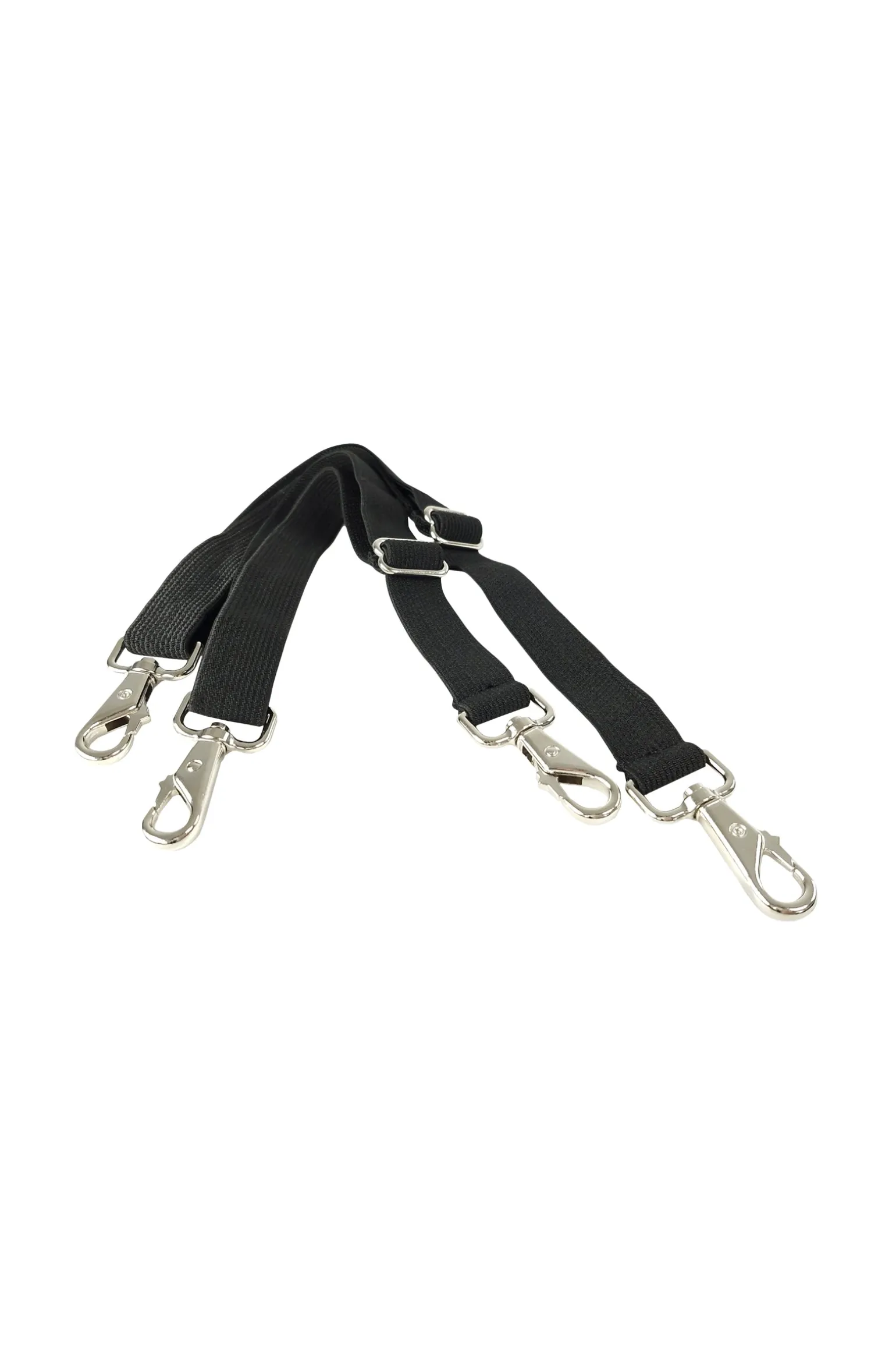 Zwei hochqualitative, elastische Beinschnüre mit Karabinerhaken aus Metall.