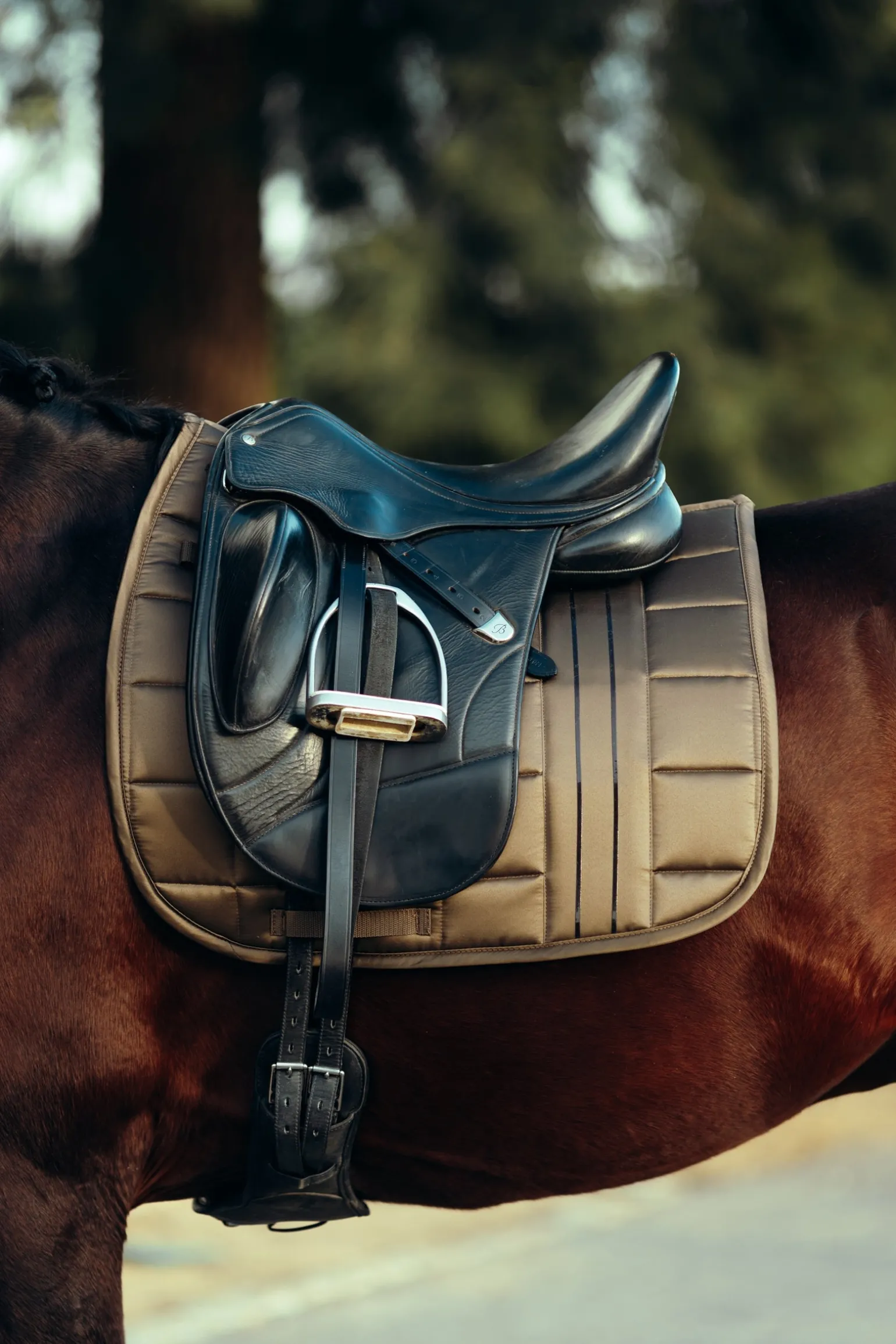 Unsere Schabracke B Vertigo Drew ist mit einem schnell trocknenden Futter ausgestattet, das atmungsaktiv und feuchtigkeitstransportierend ist. Die quadratische Steppung sorgt für Komfort unter dem Sattel, und die Silikonstreifen und das Logo geben Halt, damit der Sattel nicht verrutscht. Die gedeckten Farben sind zeitlos und passen gut zu deinem Sattelzeug. Diese Schabracke ist auch im Vielseitigkeitsschnitt erhältlich. Kombiniere sie mit unserer B Vertigo Fliegenhaube, Hufglocken und Gamaschen für einen kompletten Look!