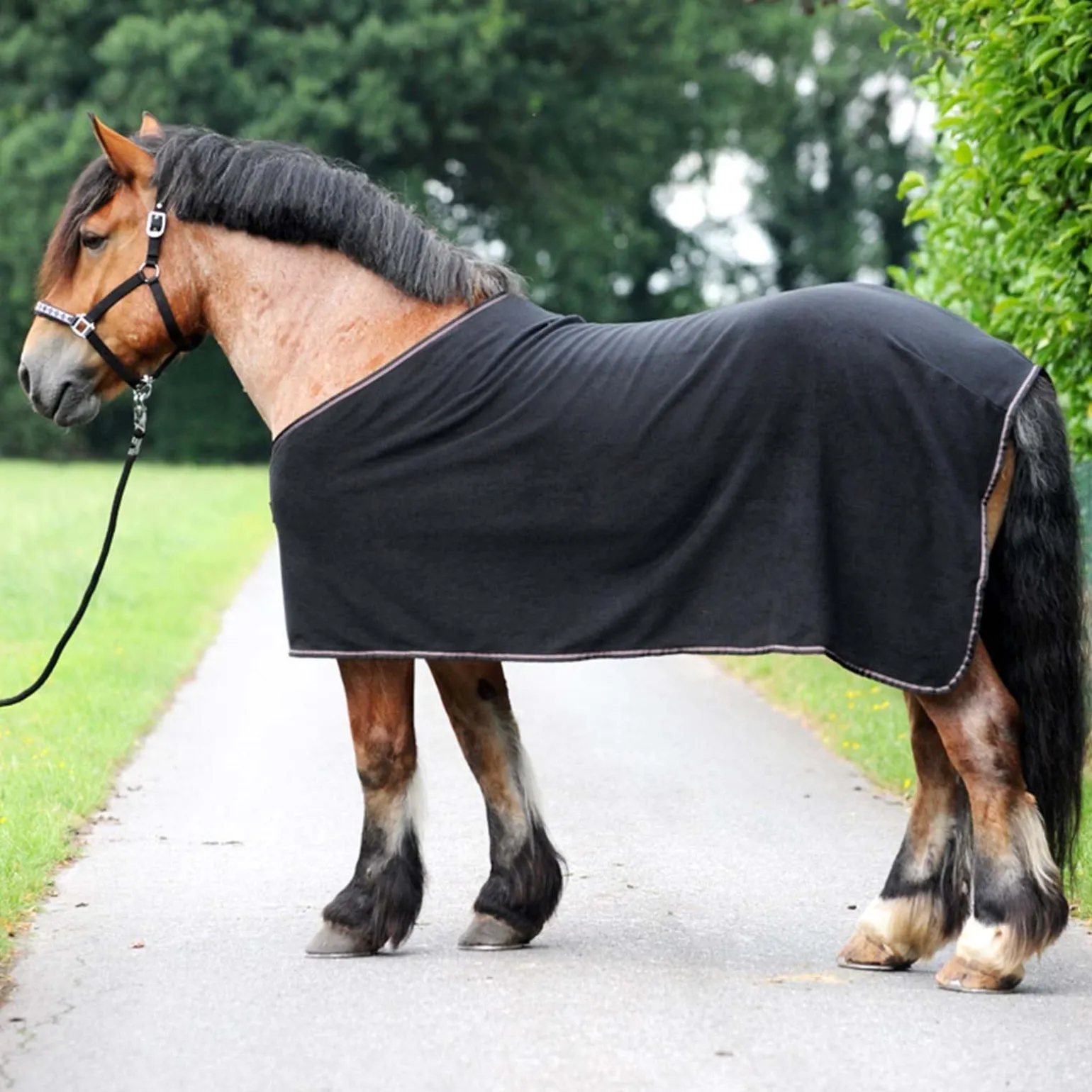 Kavalkades neue Abschwitzdecke „Ecoline Kaltblut“ bietet einen hervorragenden Feuchtigkeitstransport nach außen. Durch ihr leichtes Fleece ist die Abschwitzdecke für den Winter, aber auch für den Sommer ideal geeignet. Der Brustbereich ist extra auf Kaltblüter angepasst. Bei der Größe Kaltblut beträgt die Rückenlänge 145 cm, die Gesamtlänge 205 cm und die Seitentiefe 95 cm. Die formstabile Rückennaht sorgt für eine sehr gute Passform. Das Einfaßband besteht aus farbig abgestimmten Streifen.