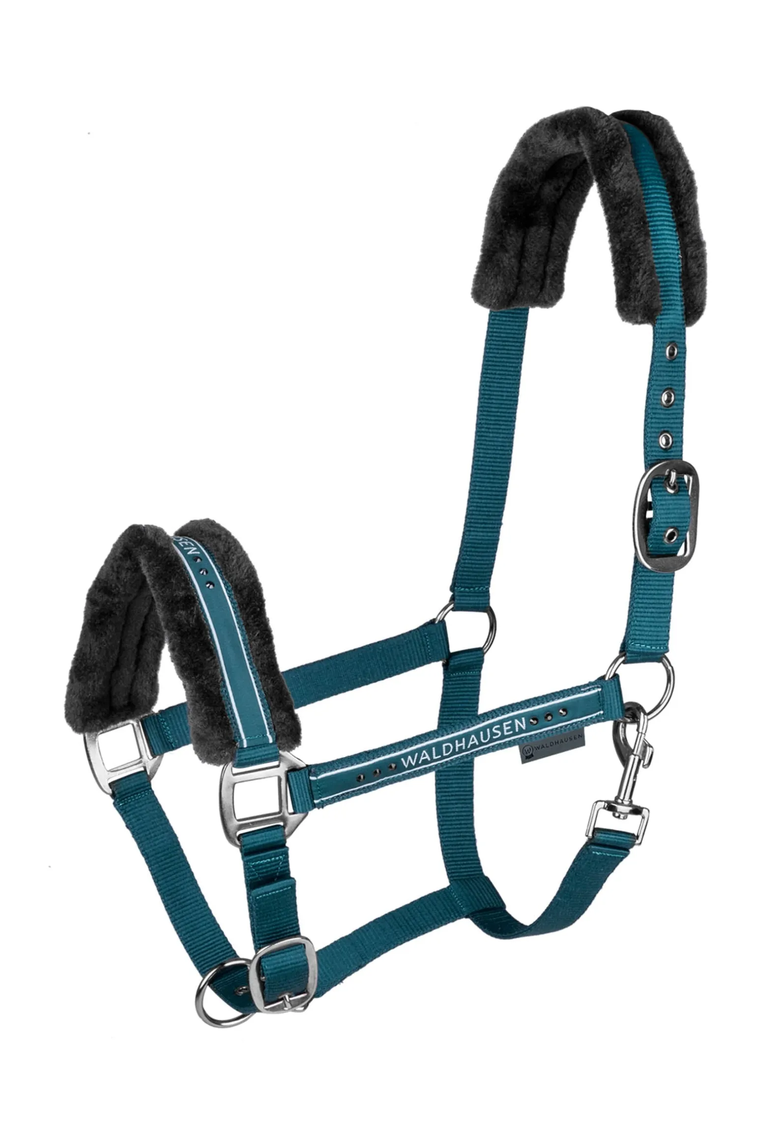 Flauschiges Halfter mit Waldhausen-Modeband und matten Beschlägen Highlight: zusätzliche Strasssteine am Nasenriemen Weiche Polsterung aus Kunstfell am Genickstück und Nasenriemen Mehrfach verstellbar am Kinnriemen und Genickstück