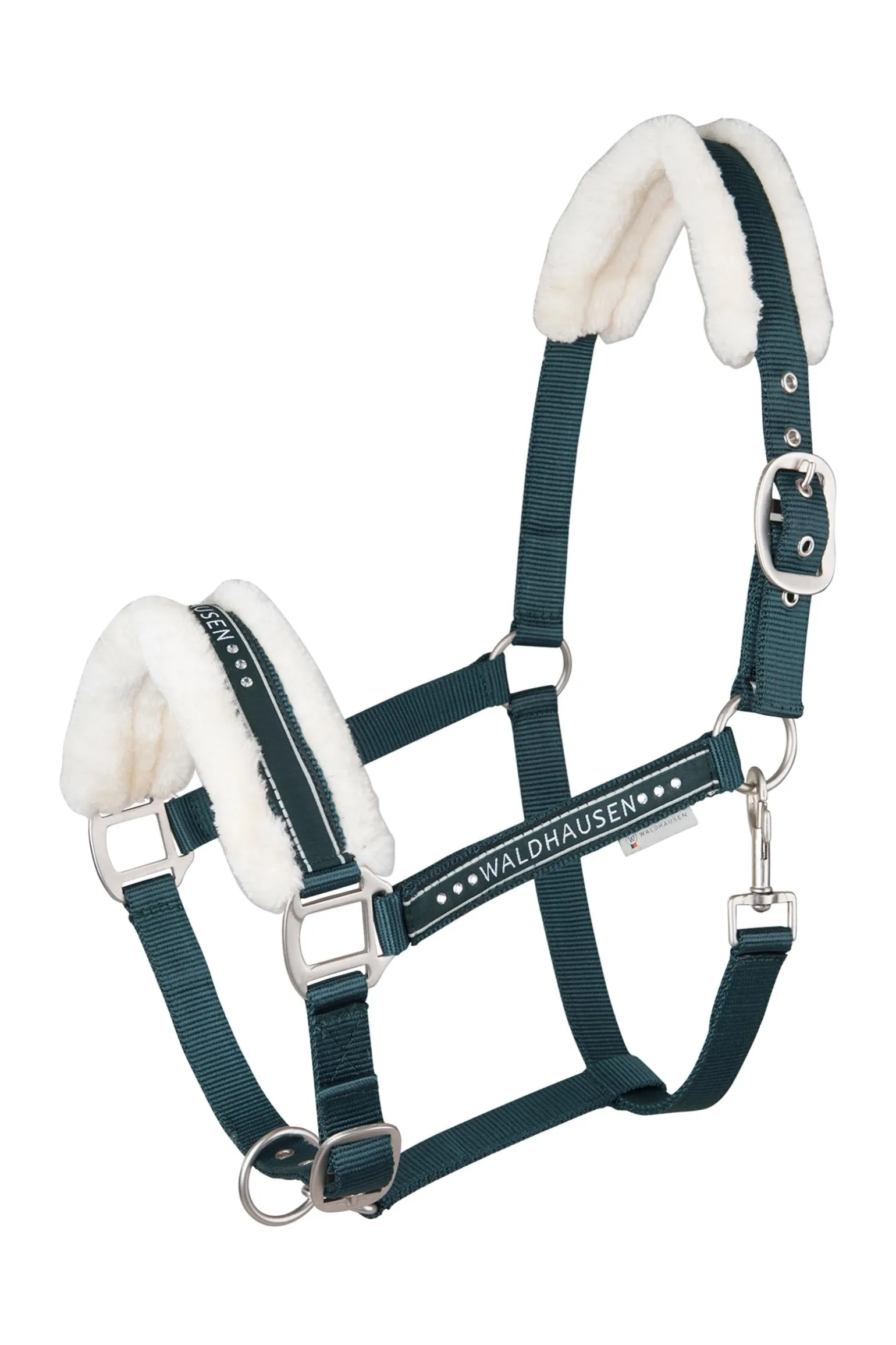 Flauschiges Halfter mit Waldhausen-Modeband und matten Beschlägen Highlight: zusätzliche Strasssteine am Nasenriemen Weiche Polsterung aus Kunstfell am Genickstück und Nasenriemen Mehrfach verstellbar am Kinnriemen und Genickstück