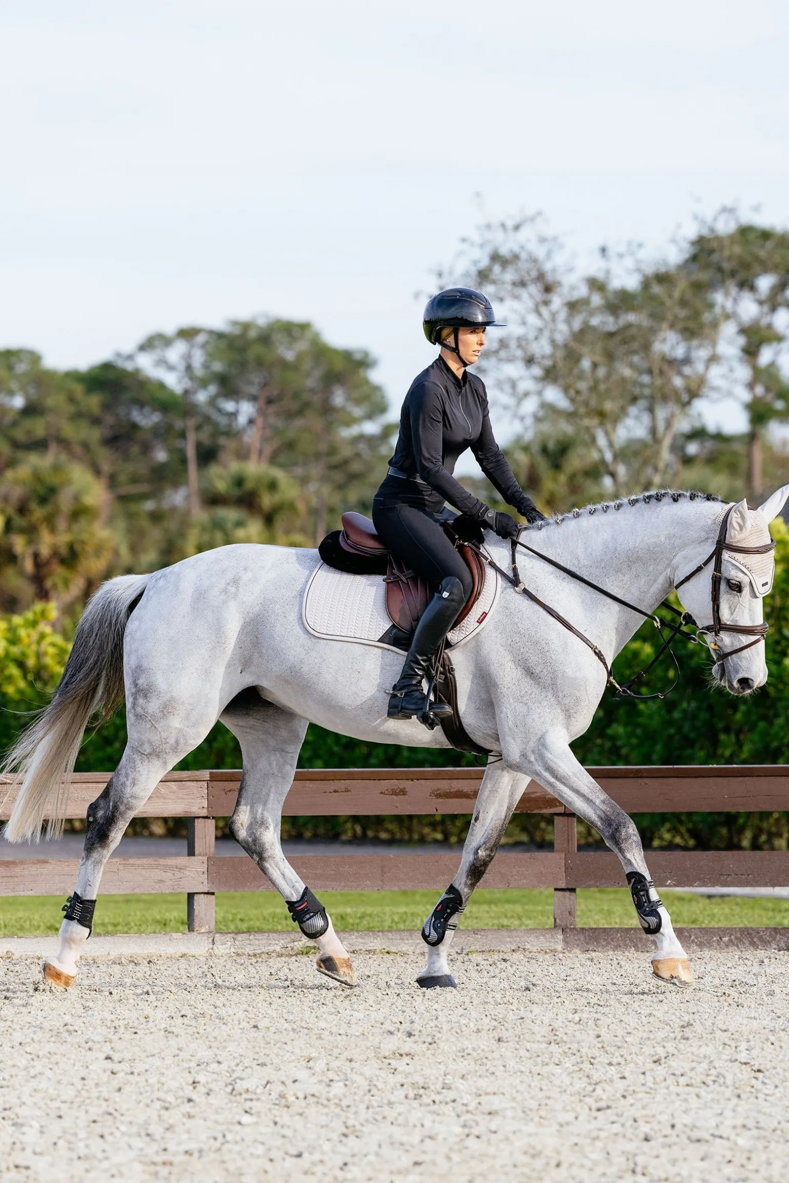 Entwickelt für anspruchsvolle Reiter mit technischer Performance, die jeder genießen kann. Das weiche Softshell-Material der Essence-Kollektion strahlt Eleganz aus. Die konturierte, gesteppte Softshell-Oberseite wurde präzise geformt, um sich perfekt an die Körperlinien deines Pferdes anzupassen, ohne zu Falten. Das weiche, atmungsaktive Innenfutter enthält kühlende Fasern. Je wärmer dein Pferd wird, desto intensiver arbeitet das feuchtigkeitsaktivierte Kühlsystem unter dem Sattel. In Kombination mit einem durchgehenden 3D-Carbon-Mesh-Rücken für maximale Luftzirkulation ist dies eine Schabracke, die speziell für leistungsstarke Pferde entwickelt wurde. Die hohe Widerristform reduziert den Druck und verbessert die Passform des Sattels. Der sportliche, matt strukturierte Kunstleder-Bereich zum Schutz des Gurtes wird durch ein geprägtes Logo ergänzt.
