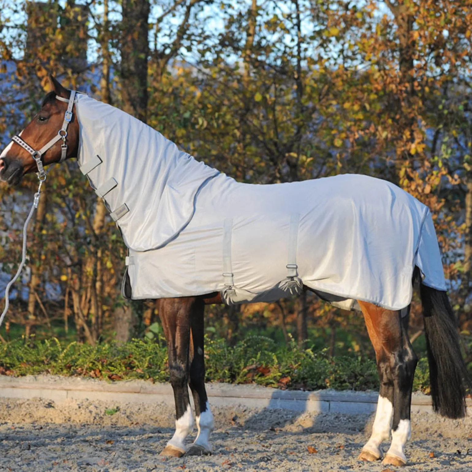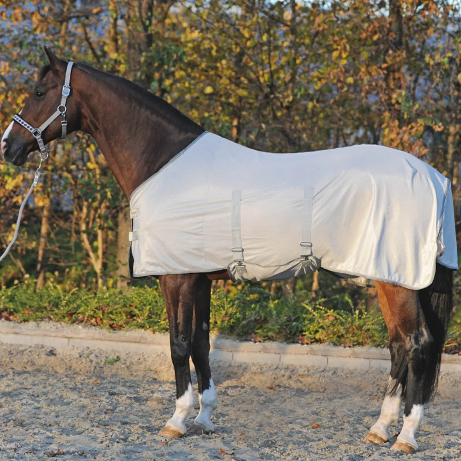 Besonders funktionale und schwere Fliegendecke aus engmaschigem Polyester-Mesh-Gewebe, das atmungsaktiv ist und optimalen Schutz gegen Fliegen und Insekten bietet. Mit doppeltem Drehhakenbrustverschluss, Schweifriemen, abnehmbarem Bauchlatz und Halsteil. Ideal für die Weide oder den Paddock.