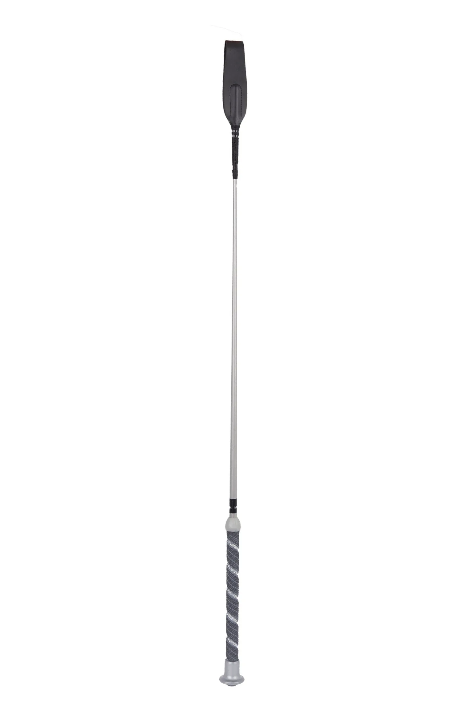 Reitgerte mit metallischer Optik und Gummigriff.