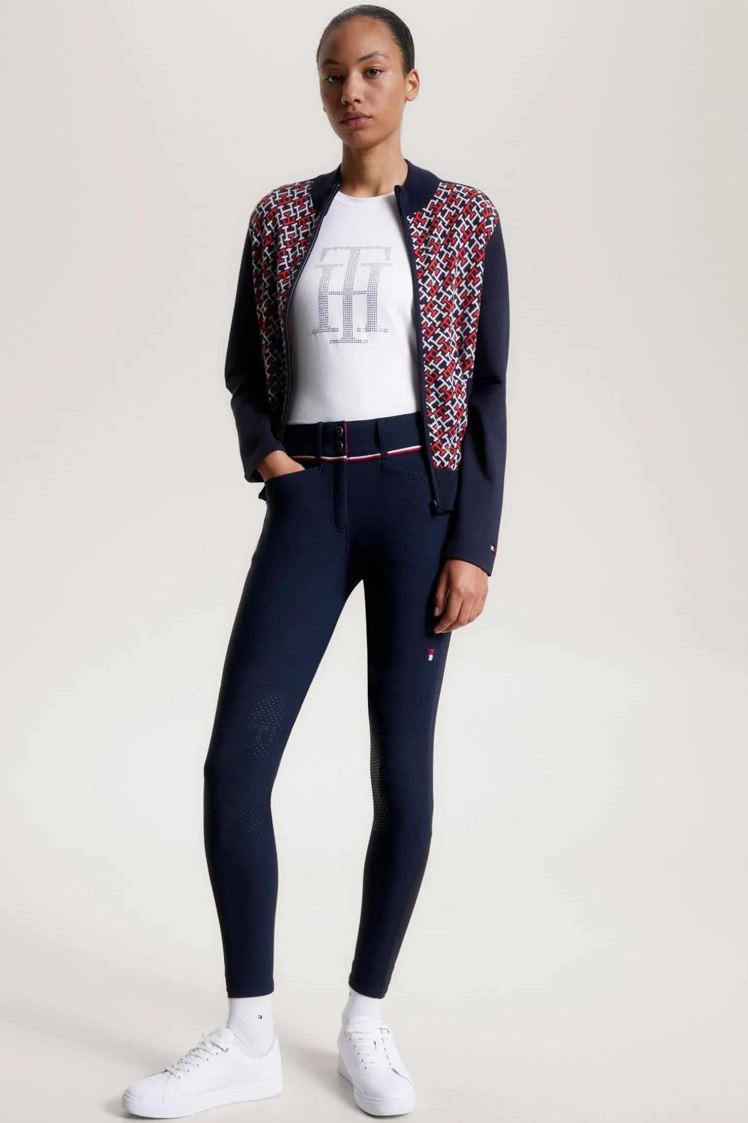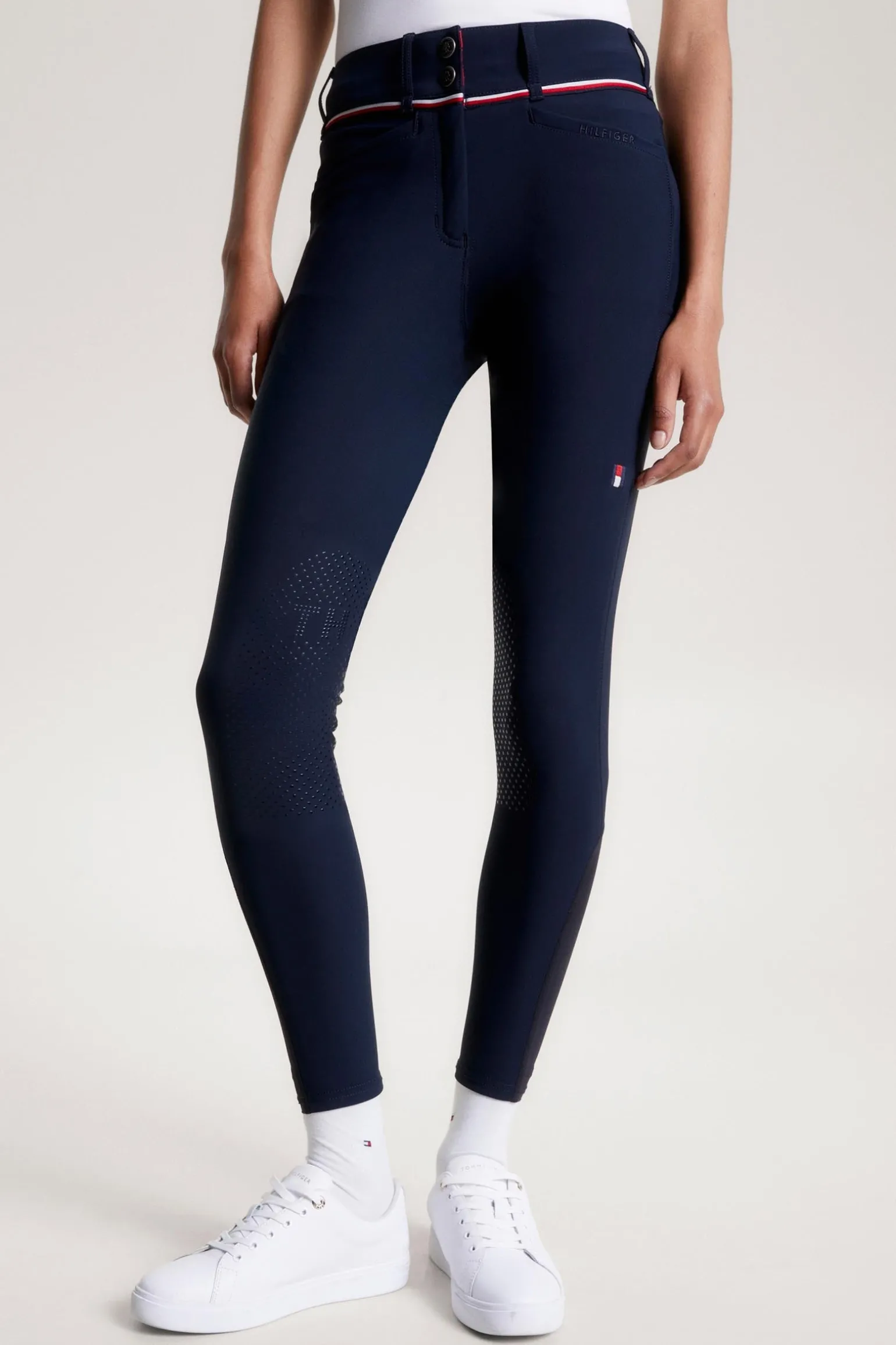 Die Geneva Reithose ist aus einem technischen, wasserabweisenden Power-Stretch-Gewebe mit einem höheren und breiteren Bund für maximalen Reitkomfort. Weicher Jerseysaum für eine sportliche Form und eine dünnere Schicht unter Ihren Stiefeln. Mit gesticktem Logo auf dem linken Oberschenkel, Global Stripe-Band am Münzfach, ‚Hilfiger‘-Stickerei auf der Vordertasche und Silikon Kniebesatz für sicheren Halt im Sattel. Fantastisches Funktionsmaterial mit zahlreichen Funktionen, darunter schnelles Trocknen, Feuchtigkeitsregulierung, UV-Schutz und 4-Wege-Power-Stretch.