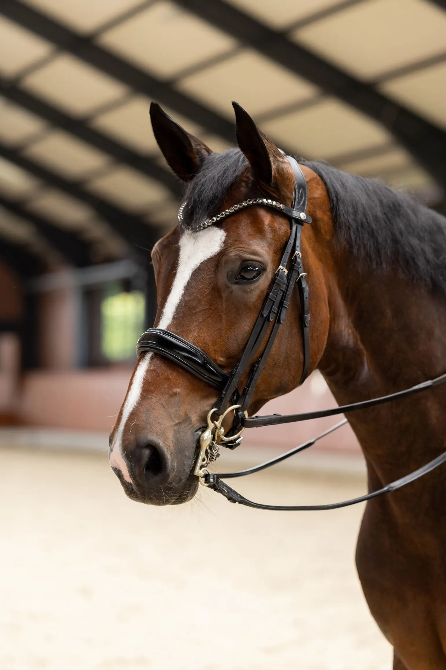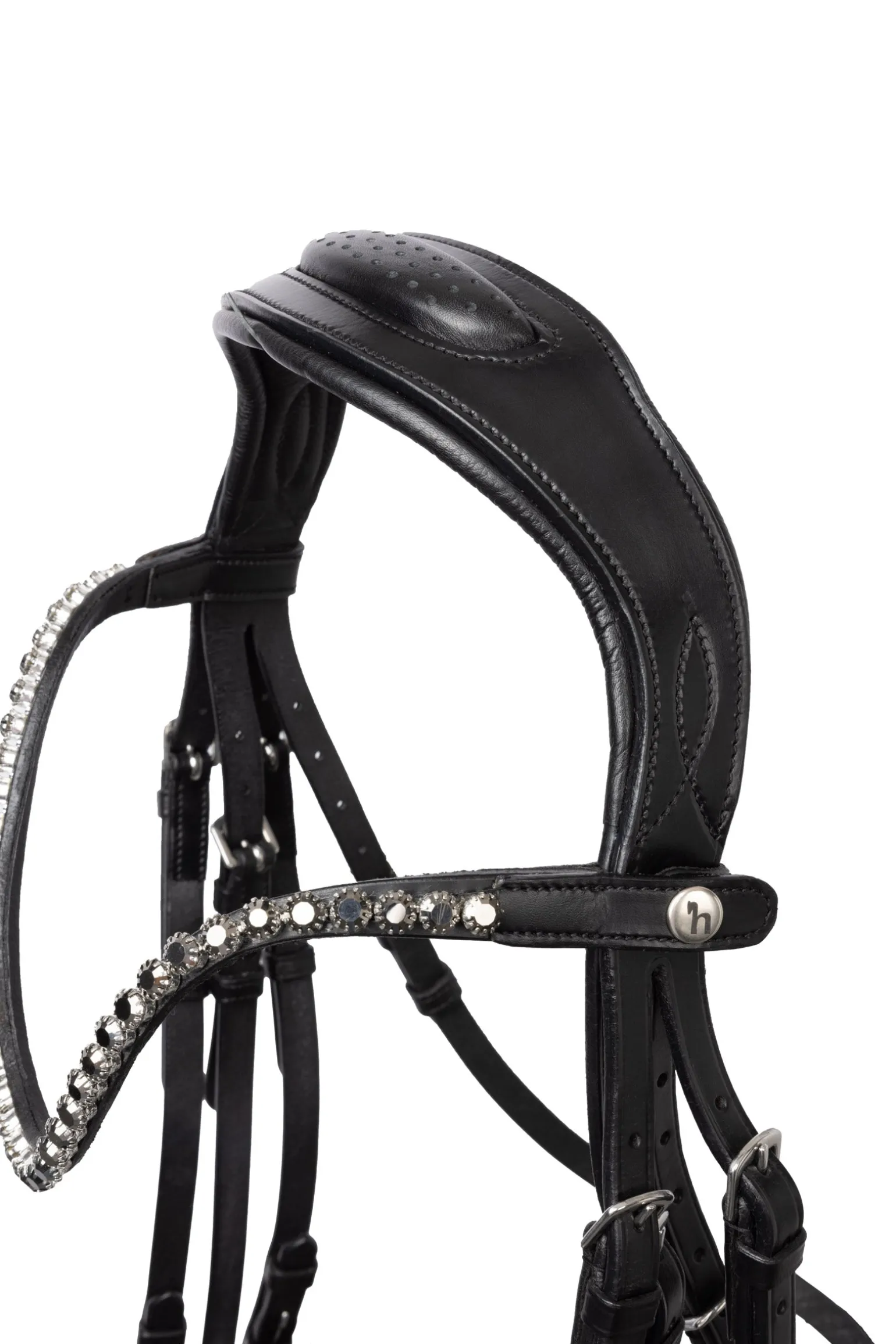 Die Glamourdale Kandare kombiniert elegantes Design mit höchstem Komfort für dein Pferd. Das anatomisch geformte Genickstück ist gepolstert und sorgt für eine optimale Druckverteilung und Atmungsaktivität. Der Nasenriemen aus Lackleder verleiht der Kandare einen Hauch von Luxus, während der edle, U-förmige Stirnriemen mit dezenten Strasssteinen für einen stilvollen Auftritt sorgt. Der Stirnriemen ist schnell und einfach austauschbar, sodass du jederzeit den Look anpassen kannst. Hochwertige Metallbeschläge runden das Design ab.