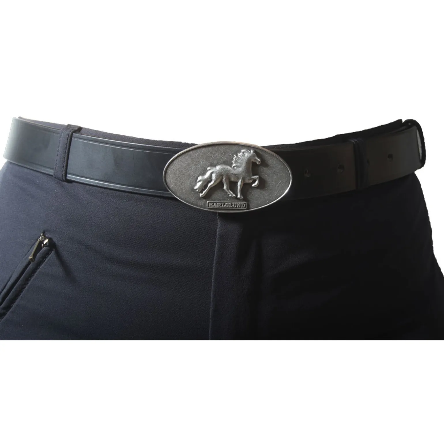 Schöner Gürtel aus gutem Qualitäts-Leder mit wunderschönem, rustikalen Islandpferde-Design auf der Schnalle. Passt zu Karlslund Reithosen.