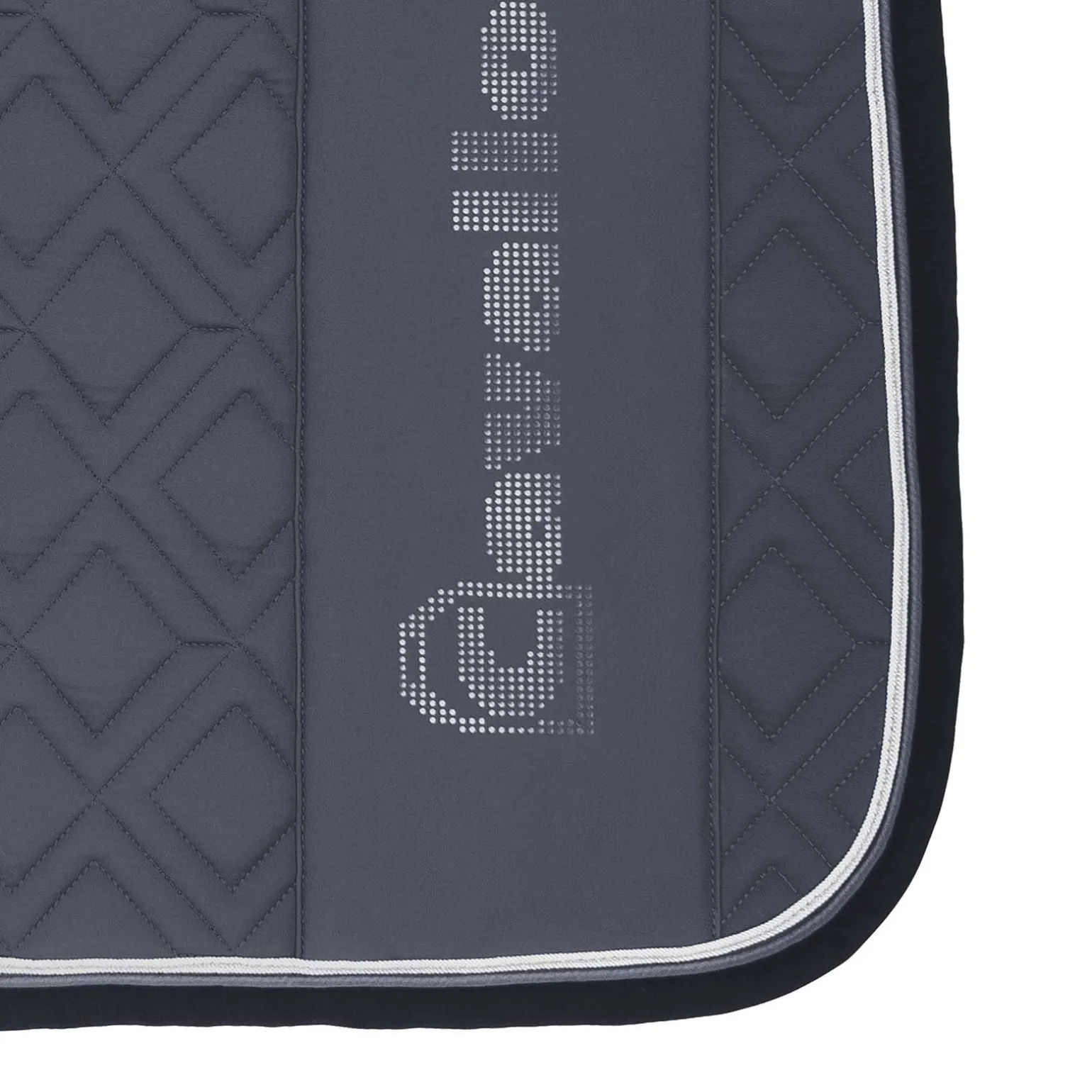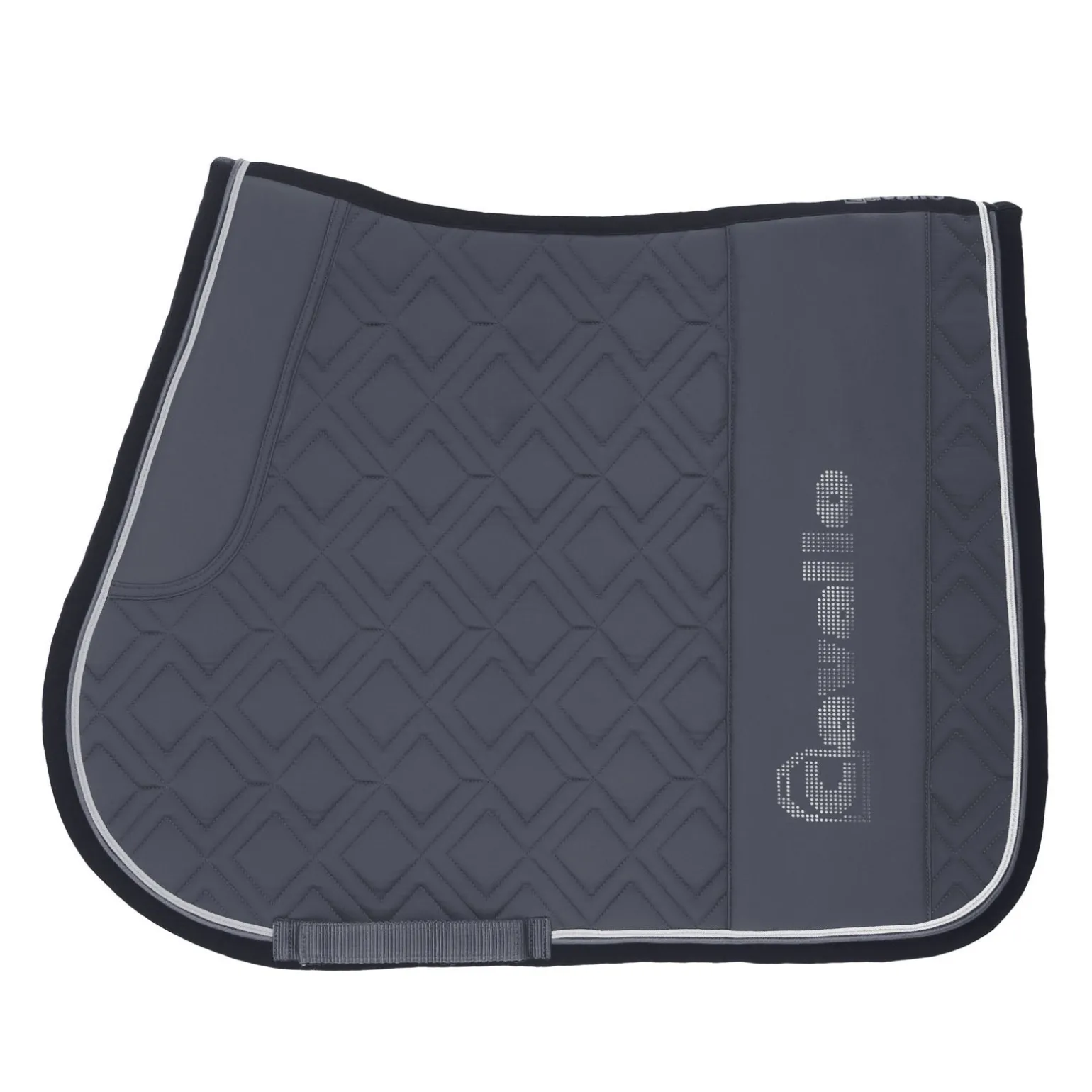 Eine sportliche Funktionsschabracke aus elastischem Softshell Material. Der Oberstoff aus Softshell ist besonders pflegeleicht. Allover mit Double Diamond Steppung versehen. Beidseitig an der Hinterseite mit einem vertikalen, glatten, tonalen Streifen versehen. Auf dem Streifen befindet sich ein perforiertes, großes, vertikales Cavallo Logo. Unter den Löchern des Cavallo Logos befindet sich schimmerndes Reflexmaterial. Die Verstärkung aus Memory Schaum an der Vorderseite gewährleistet eine optimale Lage unter dem Sattel. Eingerahmt wird die Schabracke von einem weißen Band mit schmalem silbernen Streifen. Das schnell trocknende und Feuchtigkeit transportierende Mesh-Futter ist besonders fellfreundlich und bietet höchsten Komfort. Eine formbeständige Wattierung ermöglicht der Schabracke eine perfekte Lage auf dem Pferderücken.