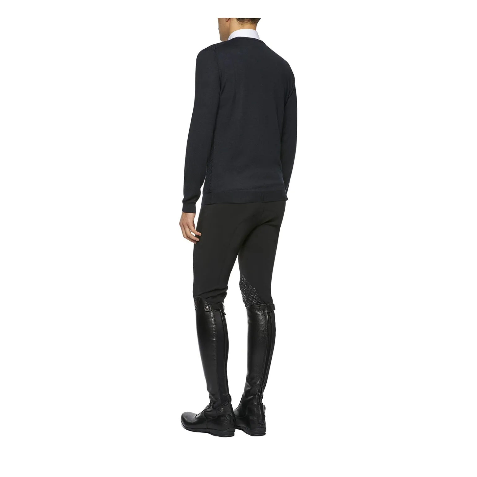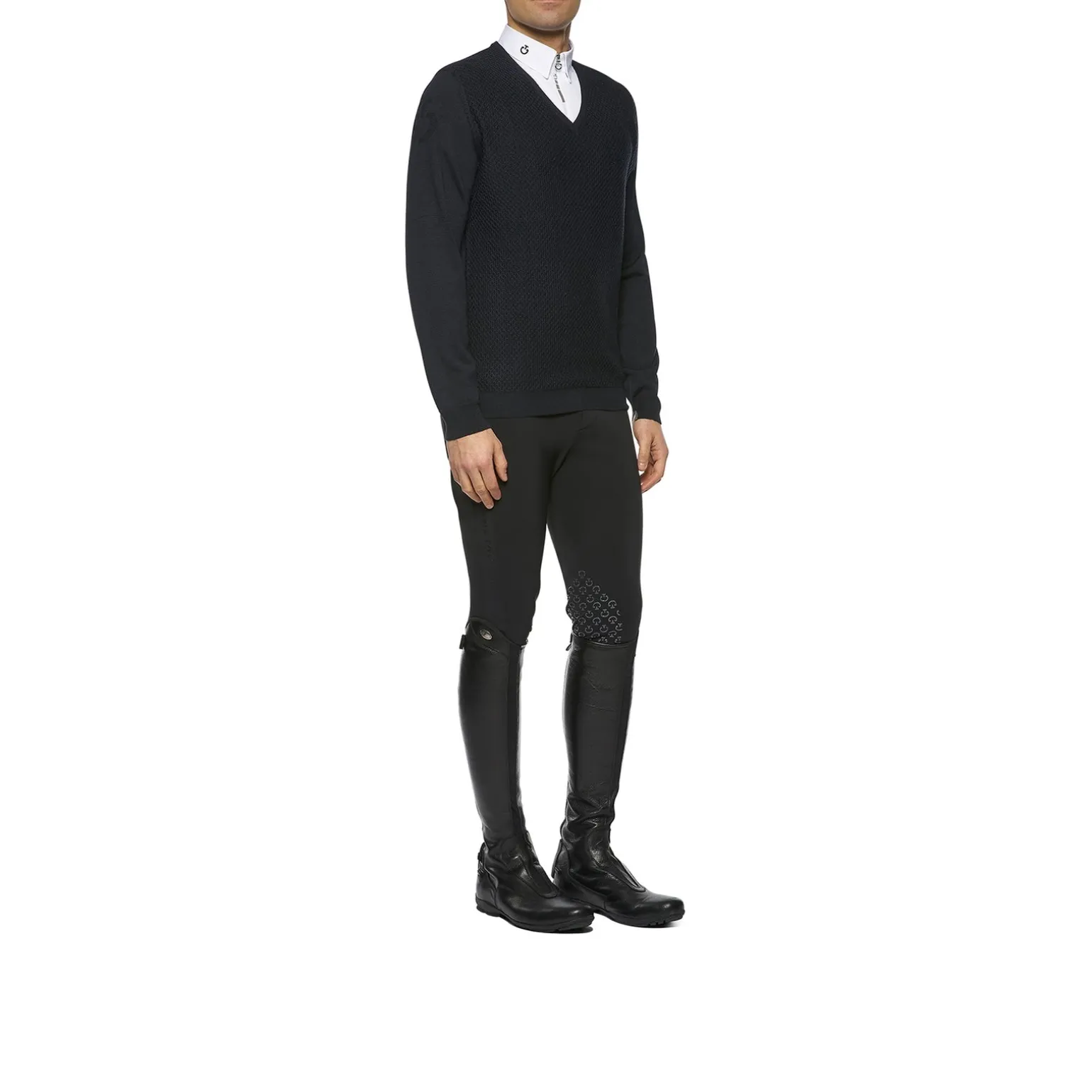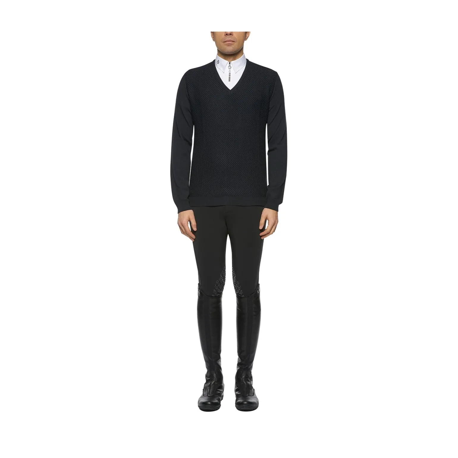 Herren-Wollpullover mit V-Ausschnitt und Wabenstruktur.