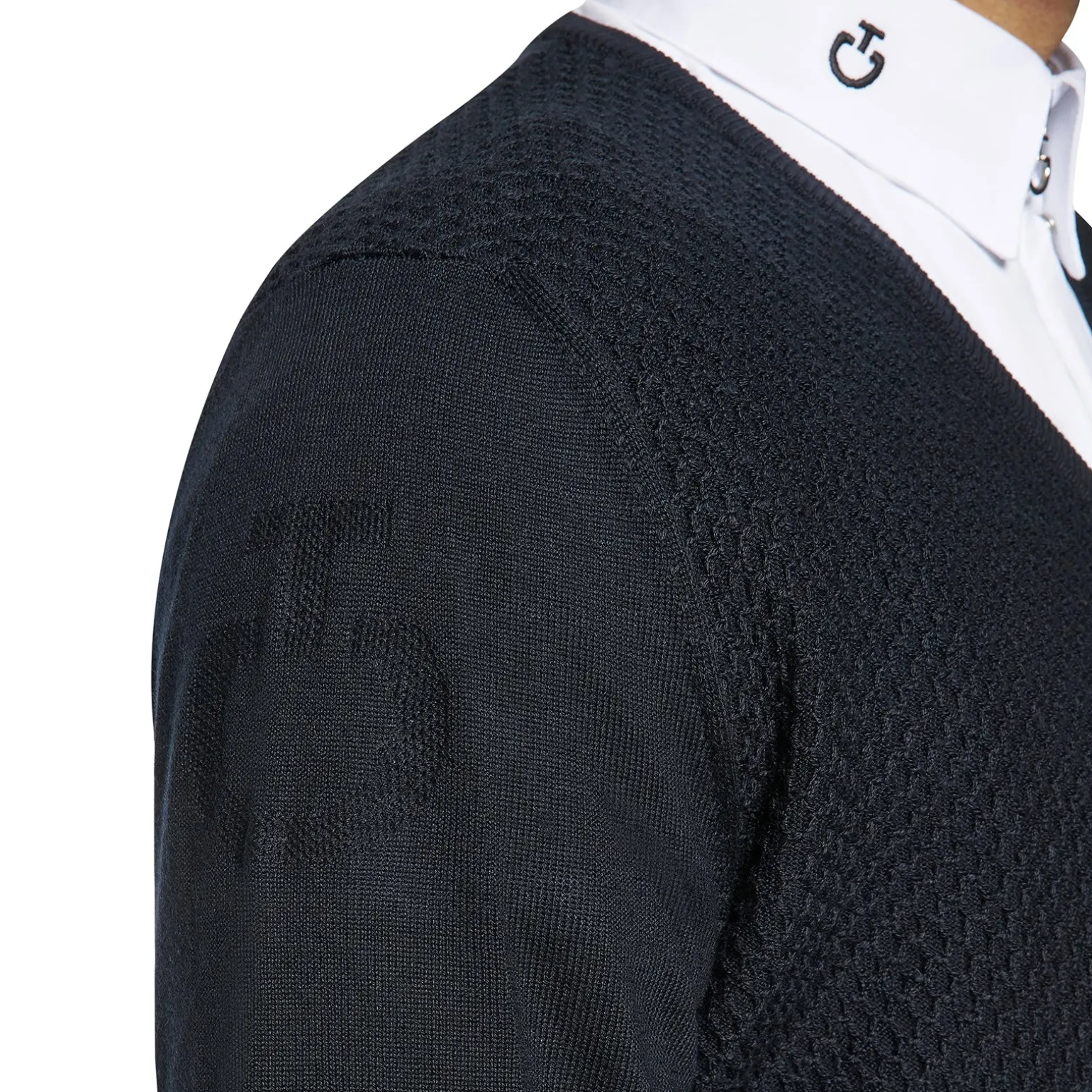 Dieser Herrenpullover ist aus weicher und warmer Wolle gefertigt, die auf der Vorderseite durch eine Wabenstruktur veredelt wird. Das hochwertige Material ist ideal für Freizeitkleidung oder für dein Training und sorgt für eine warme Körpertemperatur auch an den kältesten Tagen. Der Pullover verfügt über einen V-Ausschnitt und wird durch ein gesticktes Logo auf der Schulter veredelt.