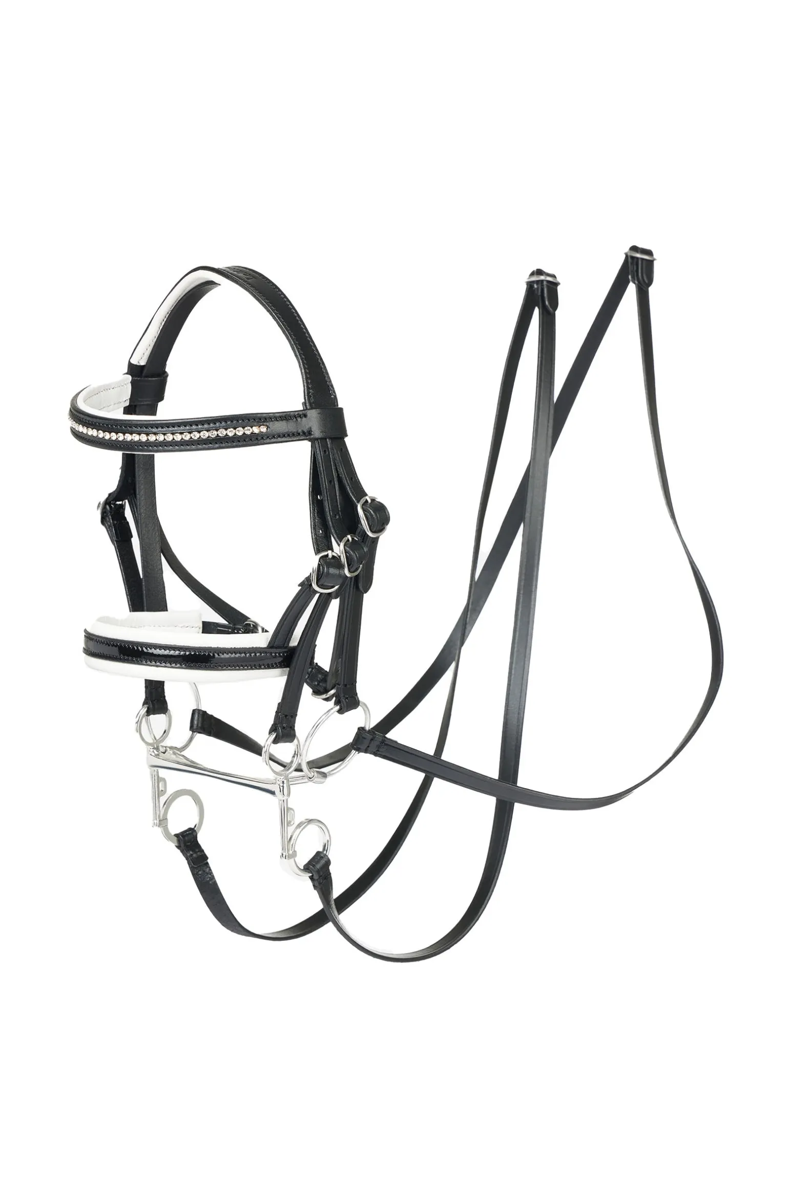 Eine Kandare aus echtem Leder, handgefertigt wie beim großen Vorbild. Die LeMieux Hobby Horse Kandare ist mit funktionalen Schnallen ausgestattet, die eine präzise Anpassung im Miniaturformat ermöglichen. Ein gepolsterter Stirnriemen mit funkelnden Kristallen verleiht den charakteristischen LeMieux-Look, während das weich unterlegte Reithalfter aus weißem Leder mit schwarzem Lackleder für ein authentisches Dressur-Design sorgt. Vervollständigt wird das Set durch ein Mini-Weymouth- und Bradoon-Gebiss sowie zwei Zügelpaare – ideal, um das Aufzäumen zu üben.