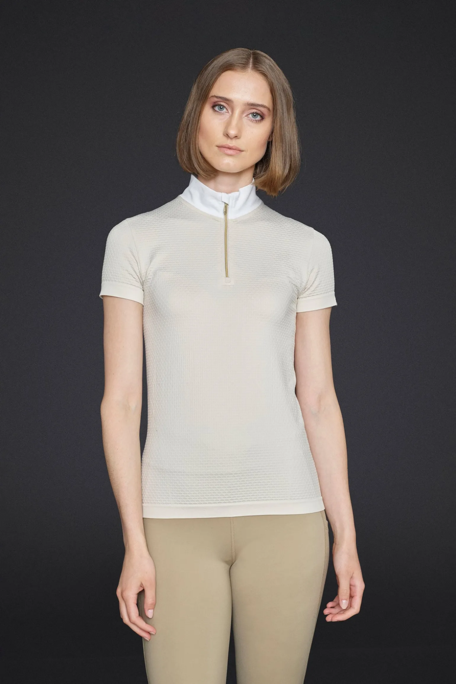 Feminines, nahtloses, turniertaugliches Tech-Top mit einem weißen Kragen.