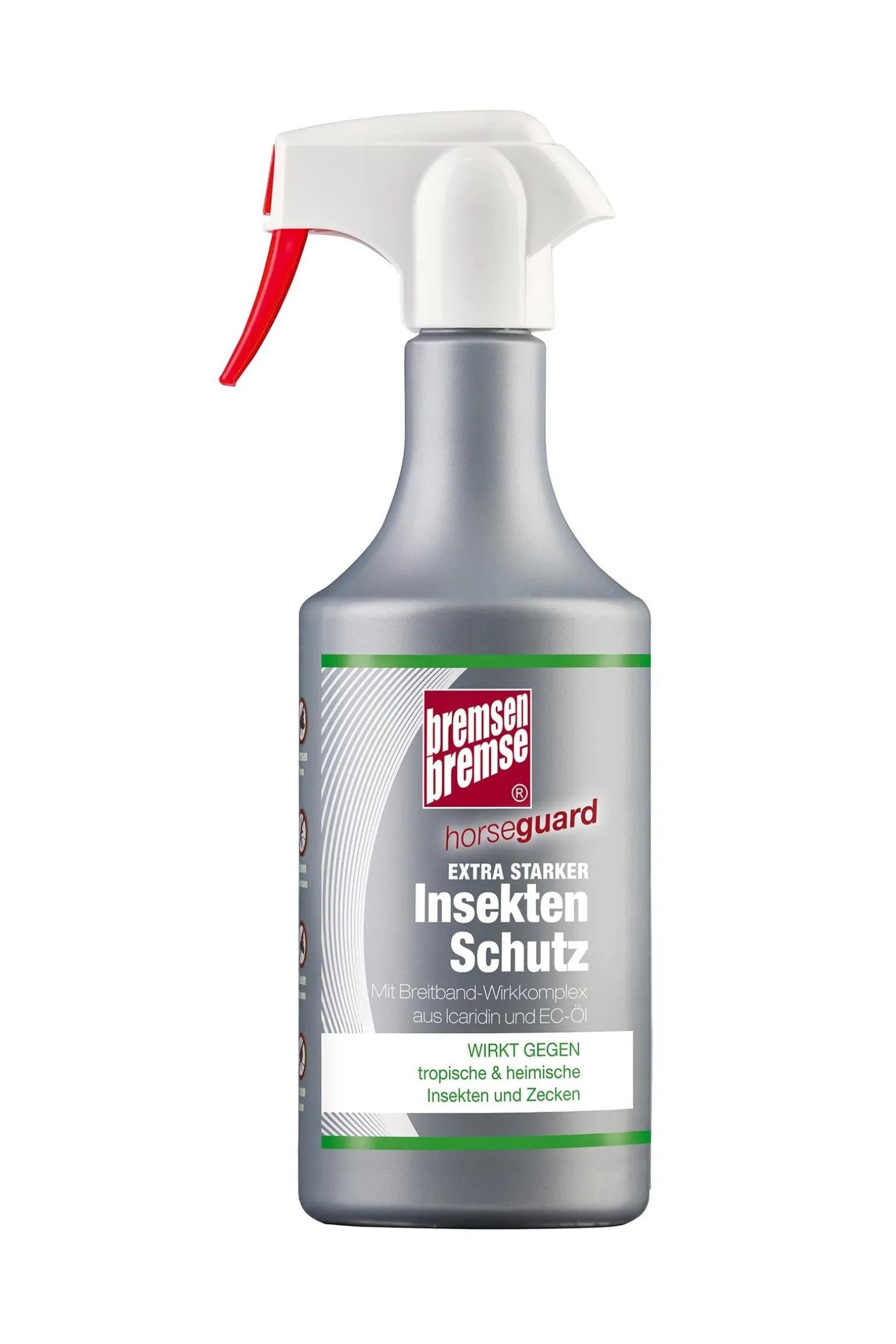 BREMSENBREMSE® horseguard ist der zuverlässige und langanhaltende Schutz vor tropischen und heimischen Insekten wie Bremsen und Mücken (auch vor den in Deutschland verbreiteten Culex-Stechmücken, welche das West-Nil-Virus übertragen können) sowie vor Zecken. Der Wirkstoff Icaridin wird von der WHO zur Mückenabwehr auch in tropischen Gebieten empfohlen und wirkt am Menschen in der hier eingesetzten Konzentration und Dosierung bis zu 8 Stunden.