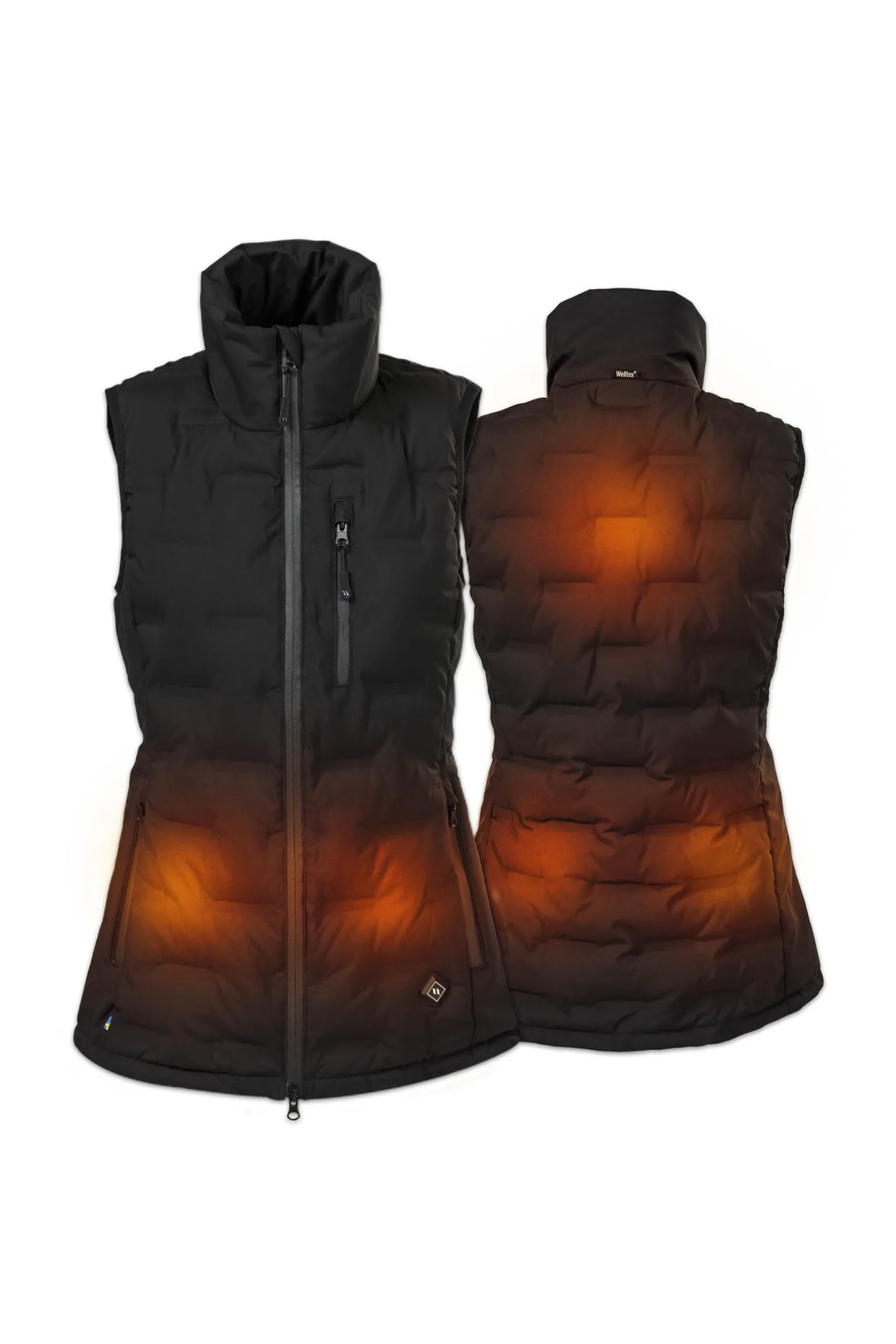 Erlebe Wärme nach Belieben und unterwegs. Die Katla W’s Steppweste bietet sofortige Wärme, ohne dass man dafür sperrige Kleidung oder mehrere Schichten braucht. Mit einem Druck auf den Logo-Knopf an der Vorderseite des Kleidungsstücks wird ein elektrisches Heizsystem aktiviert, das den Oberkörper in eine warme Schicht einhüllt.