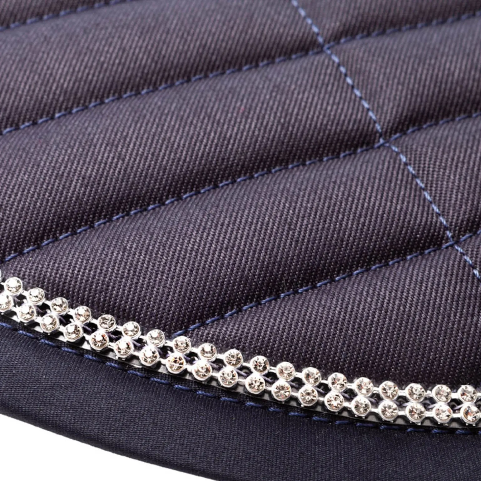 Strasssteine und ein Einfass in Satin verzieren den Rand der gesteppten Schabracke. Die feste Füllung und der geschwungende Rückenbereich bieten einen optimalen Sitz. Schweißaufsaugendes Untermaterial.
