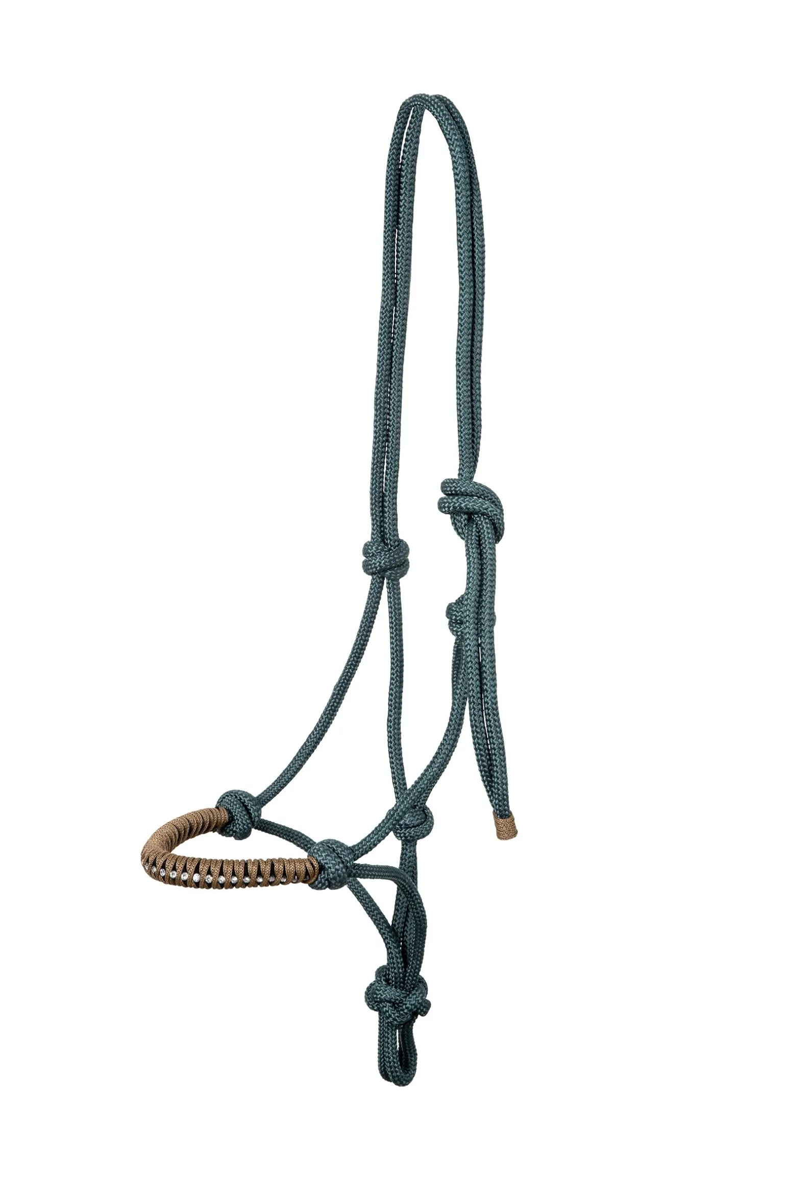 Knotenhalfter, leichtes Gewicht. Perfekt für Horsemanship, Bodenarbeit und Trekking. Die Knoten können individuell angepasst werden. Das Nasenband ist in Kontrastfarbe geflochten und mit Glitzersteinen besetzt.