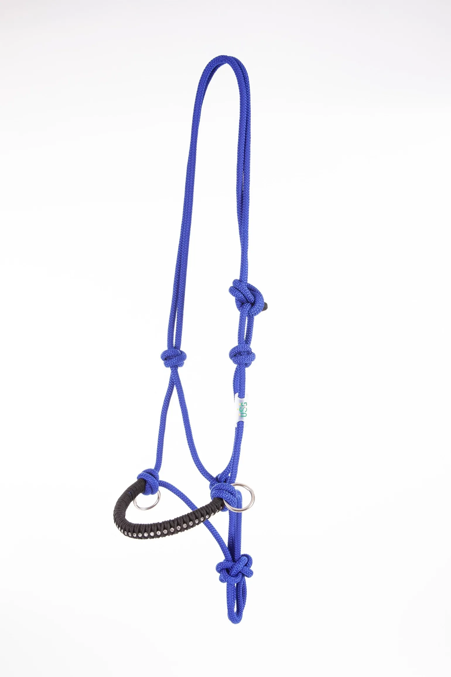 Knotenhalfter, leichtes Gewicht. Perfekt für Horsemanship, Bodenarbeit und Trekking. Die Knoten können individuell angepasst werden. Das Nasenband ist in Kontrastfarbe geflochten und mit Glitzersteinen besetzt.