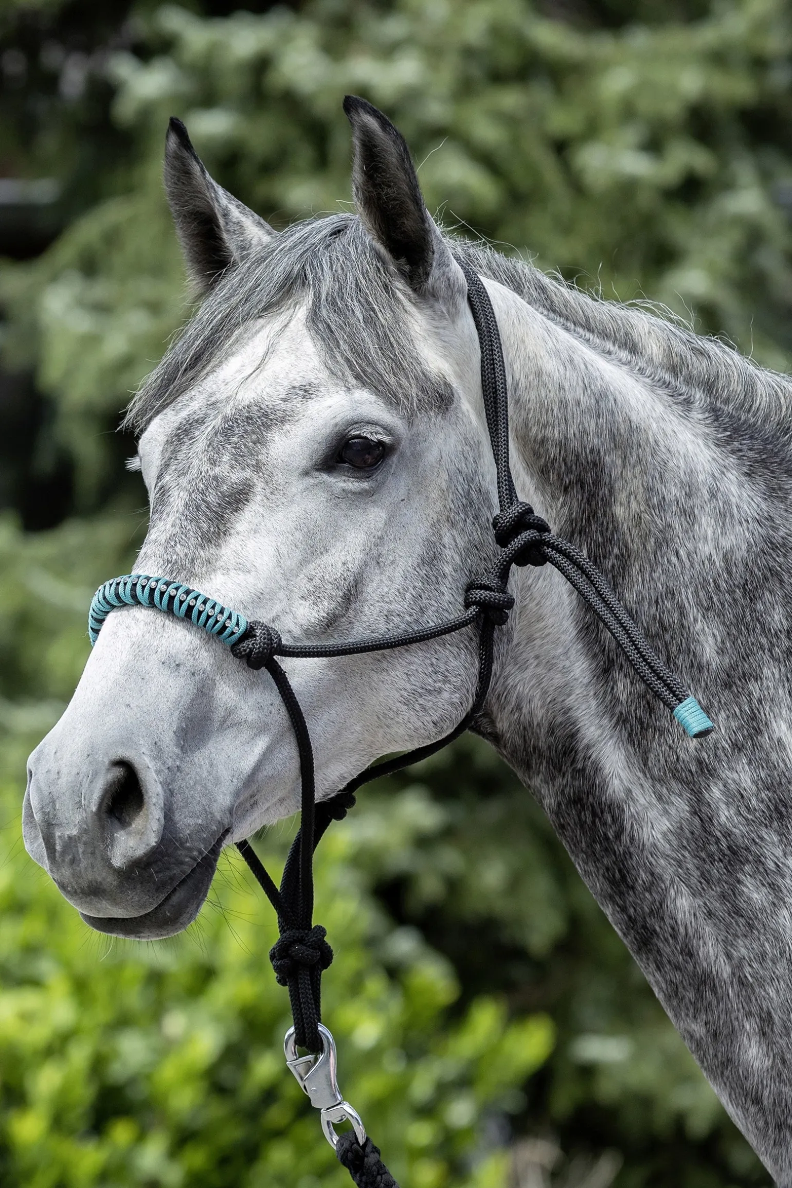 Knotenhalfter, leichtes Gewicht. Perfekt für Horsemanship, Bodenarbeit und Trekking. Die Knoten können individuell angepasst werden. Das Nasenband ist in Kontrastfarbe geflochten und mit Glitzersteinen besetzt.
