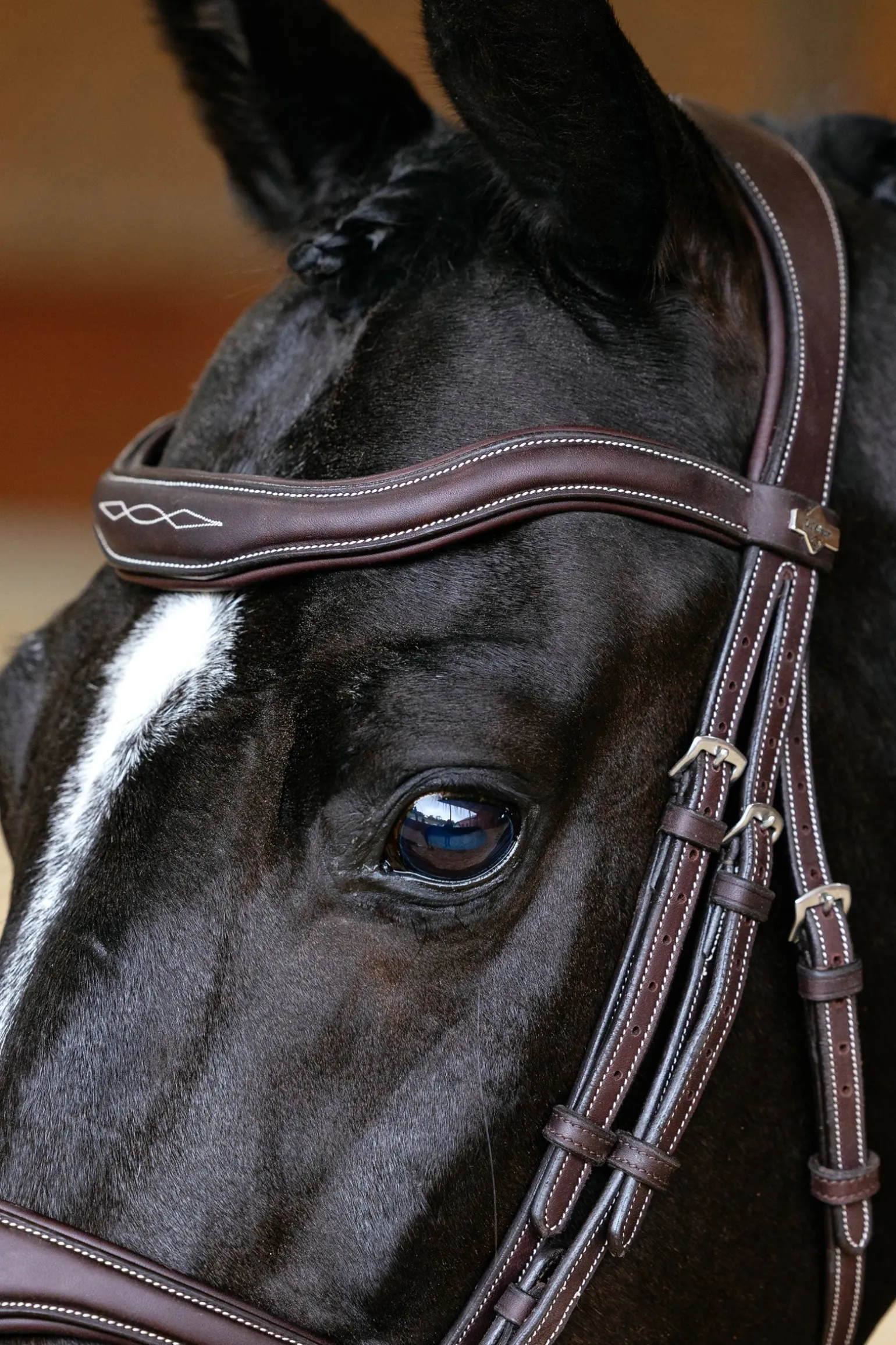 Das Kudos Contour Zaumzeug steht für echte Qualität – mit elegant geformtem, gepolstertem Stirn- und Nasenriemen samt dekorativer Ziernaht und einem abnehmbaren Sperrriemen. Die dezente Schlaufe für den Sperrriemen liegt bündig im Nasenriemen und lässt sich bei Bedarf vollständig entfernen, wodurch sich dieser schöne Trensenzaum für viele Pferde eignet. Für maximalen Komfort werden sensible Druckpunkte ausgespart und eine gute Durchblutung ermöglicht. Das anatomisch geformte Genickstück mit weich gepolstertem Ausschnitt im Ohren- und Nackenbereich trägt zur gleichmäßigen Druckverteilung bei.