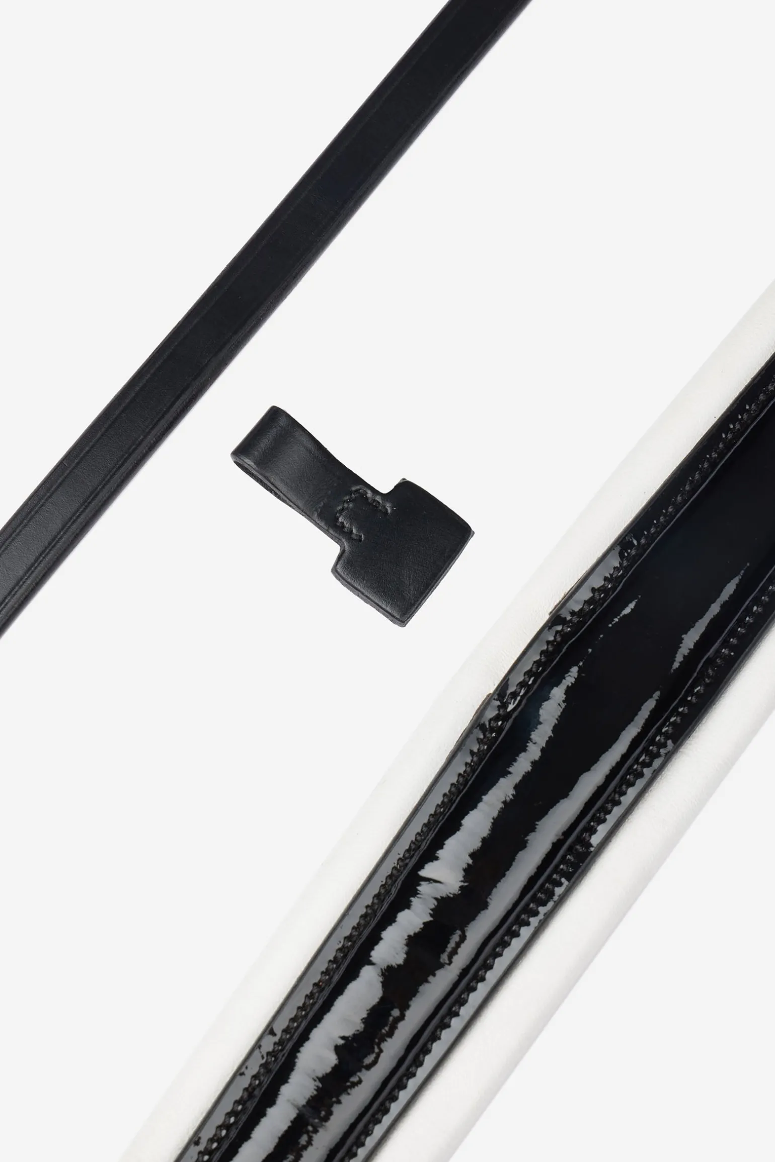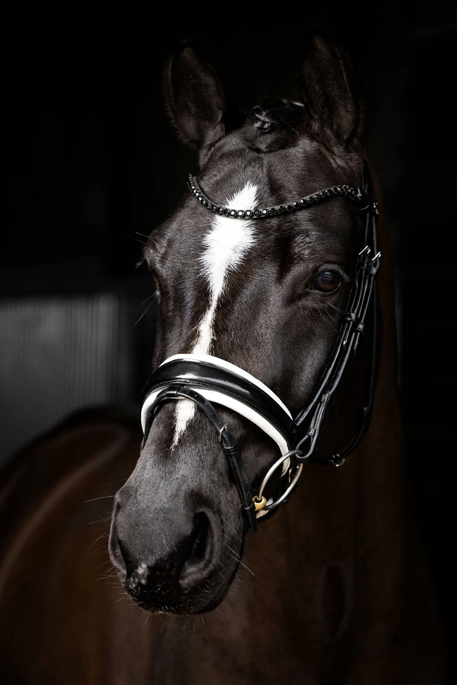 Diese spezielle Dressurkandare wird aus hochwertigem, vorgeöltem italienischem Leder gefertigt und verfügt über rundgenähte Elemente sowie einen abnehmbaren Sperrriemen. Das anatomisch geformte, gepolsterte Genickstück bietet angenehme Freiheit hinter den Ohren und verteilt den Druck gleichmäßig über das Genick. Das abnehmbare Stirnband mit Clincher-Details ist geschwungen, weich gepolstert und mit Kristallen verziert – für eleganten Tragekomfort. Das Reithalfter mit Lackbesatz und Umlenkverschnallung ist besonders gut gepolstert. Rollenschnallen am Kinnriemen und Sperrriemen ermöglichen eine präzise Anpassung – ideal für eine feine Einwirkung. Eine Kandare mit Ausdruck, die deinem Auftritt eine dezente, turniergerechte Eleganz verleiht.