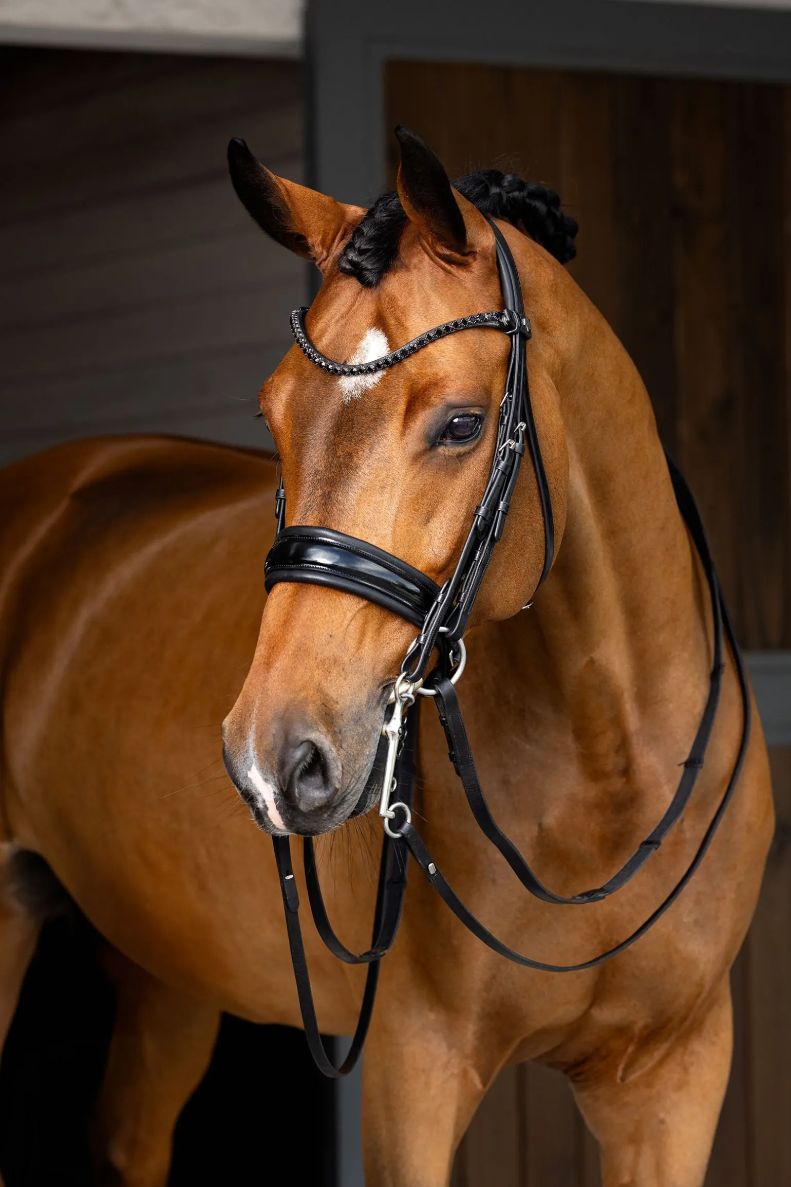 Gefertigt aus hochwertigem, vorgeöltem italienischem Leder, überzeugt diese Kandare mit einem anatomisch geformten, gelgepolsterten Genickstück, das hinter den Ohren für optimale Freiheit sorgt. Das abnehmbare, geschwungene Stirnband mit Kristallen und das gelgepolsterte Reithalfter aus Lackleder verleihen der Trense den unverkennbaren LeMieux-Stil, während der unauffällige Kehlriemen für eine klare Linienführung sorgt. Ein weich gepolsterter Kinnschutz mit Gelauflage rundet den Komfort dieser Premium-Kandare ab.